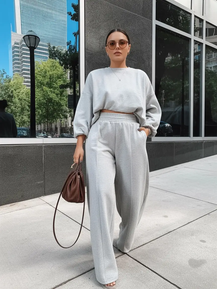 Matching sets are on a serious moment – and deservedly so. Minimal luxury is the definition of this light gray co-ord. It is minimal but sculptural, which endows soft curvy clothes with aesthetic power without making them inaccessible. The sweatshirt is cropped just above the waist and the pants are wide-legged so as to create an impression of relaxed proportions.