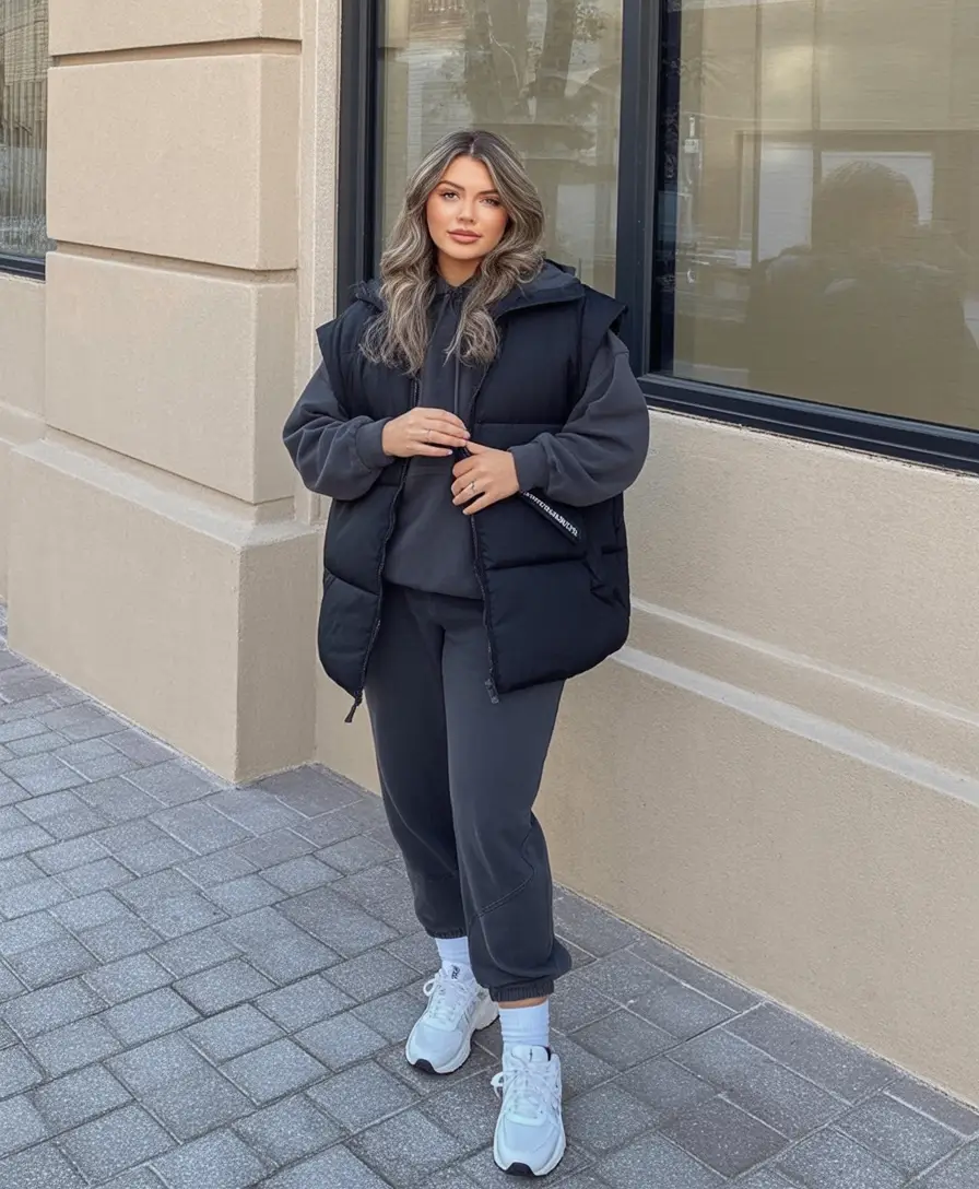 It is very empowering in a way to wear a puffer jacket on top of a solid hoodie outfit. It tells: I am warm, yet I came to kill. The palette of black on charcoal is not dramatic and the white sneakers bring that fresh sporty look that makes the curvy outfits winter street style.