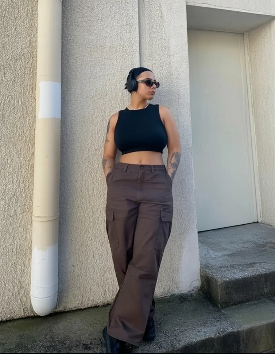 Cargo pants are returning, however, not the ones of the early 2000s. The updated version of 2026 is smoother, smarter and mobile. I am obsessed with the way that this appearance is both functional and attitude-driven: the cropped black top is focused on the waistline, and the brown cargos have a structured look that provides the outline with weight and rhythm. It is a lot of I am too busy, and yet hot, – and I like that.