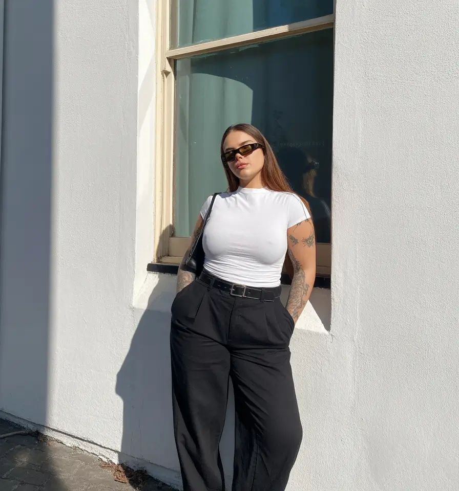 Black and white is something that is eternal. This appearance – tight white t-shirt hitching into customized black trousers – is a masterpiece in curvy clothes elegant in a luxurious manner. It is clean, assertive, and speaks in a subtle manner. It takes a structured tee and the best belt to make the simplest out to be the most sophisticated.