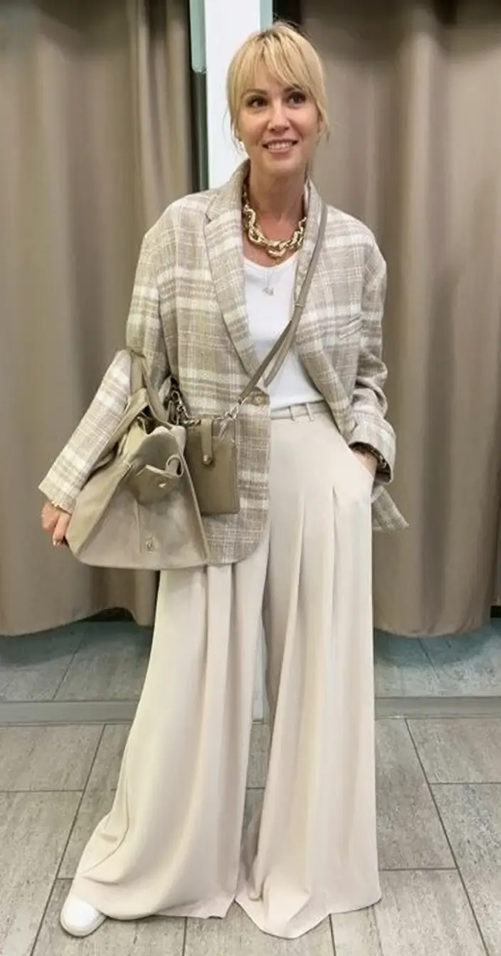 I love the laid-back chic of a palette of warm neutrals, and I love it in early fall, when it isn t yet coat weather, but you re already feeling the need to be pulled together. This look is all about that cozy-sleek balance. The wide-leg trousers in soft material make it sporty and elegant but not fussy, and the oversize plaid blazer gives it the right amount of tailoring to make it city-smart. The chunky gold chain, taupe tote, and white sneakers? Pure magic. They say: I dress for myself.