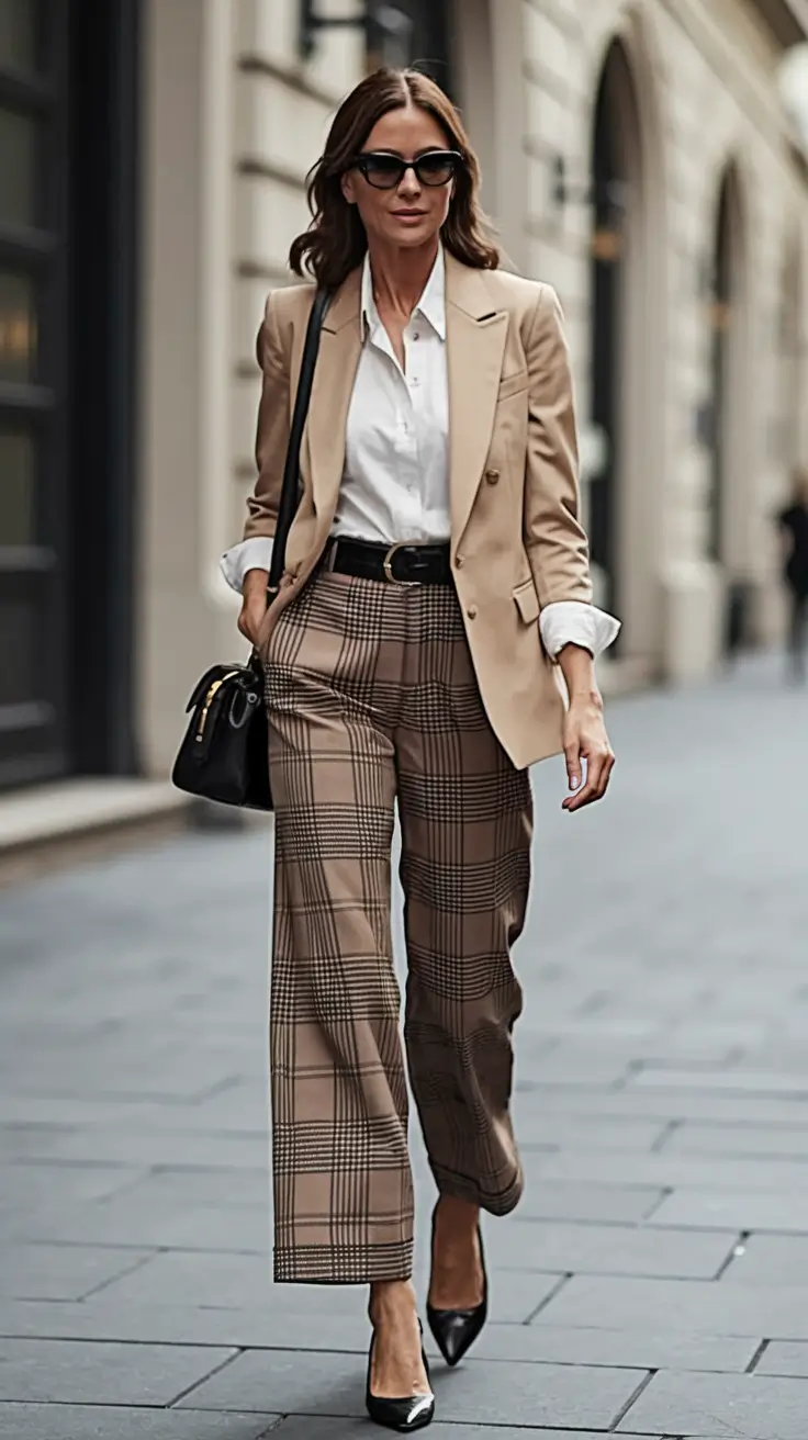 This one just provides me with all the customized excitement that I desire as the air begins to get cool. The retro-inclined plaid wide-leg pants contrast easily with beige sharp-shouldered and stylishly tailored blazer. The whole outfit is secured with a neat white shirt and the black belt and slim accessories make it elegant and organized. It is cool-girl intellectual power to adult females who understand how to operate.