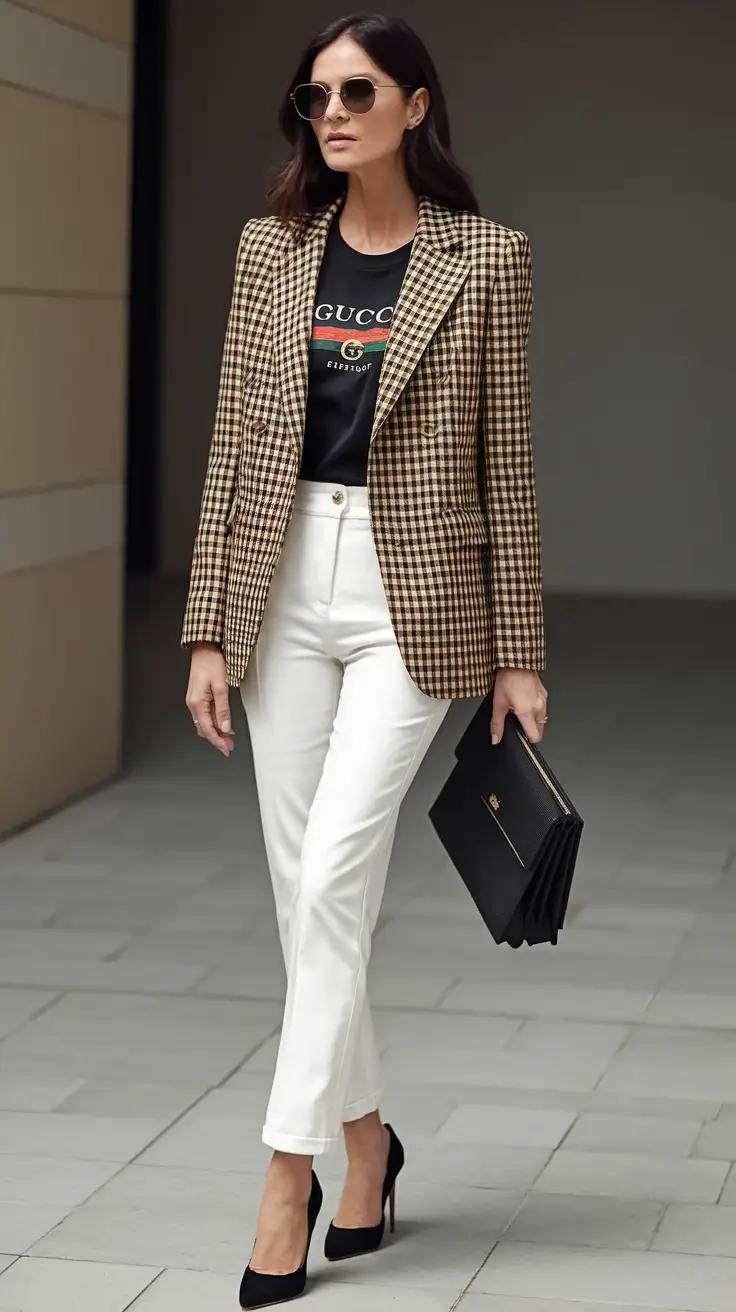 This outfit demonstrates that graphic tees are not casual disposable items at all, on the contrary, when done right, they are rather sophisticated. This is headed by the customized gingham blazer that is worn over a bright designer tee and matched with clean white trousers. Throw in a slick black clutch and heels and you have a look that is both luxurious and street-edgy in the most intelligent capacity.