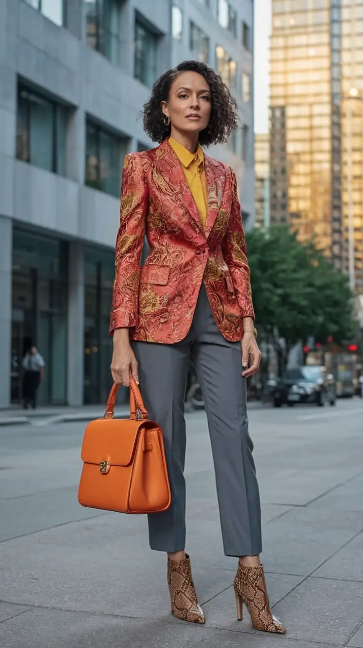 This is the appearance of the woman that comes into the room and remains in your memory. The baroque-pattern blazer of warm reds and bronze is simply astounding, and the combination of slate gray trousers, snakeskin booties, and pumpkin-orange handbag is simply the cherry on the cake. Unexpected, yet perfectly harmonious.