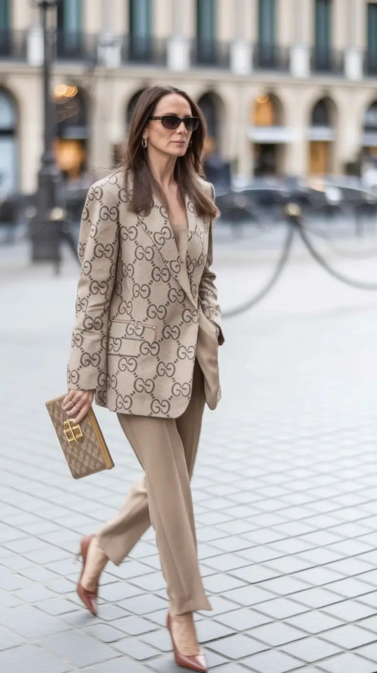 This look is quiet luxury turned up to eleven. The extra-large GG-logo blazer is legendary and uncompromisingly bold-combined with the traditional tan trousers, matching heels and clutch in the same monogram. It is a brand-forward minimalism lesson: a single powerful theme, used sparingly.