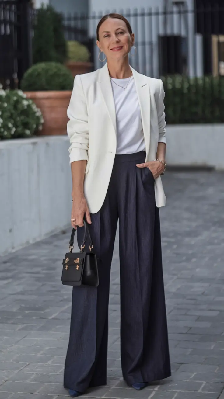 It is firmly in the fall wardrobe of women over 40 2025 edit chic, reliable and smart. The trousers add texture and professionalism, and the coat makes the entire appearance mellow. It is the type of outfit you could put on in the morning and go to work and then in the evening, you do not have to change because you have plans.
