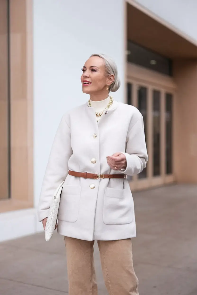 It goes well with the fall outfits for women over 40 classy category. The fitted sleeves and the high neckline give it shape and the belt adds definition to the loose coat. The palette is joined together with the white clutch and gold jewelry into one clean, soft-color vision.