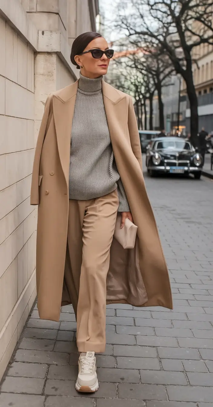 This outfit is where cozy meets city-sleek. A long coat of camel wool cascades over the soft grey ribbed turtleneck and camel trouser, and complete the look with sporty beige sneakers and a bare minimum clutch. It’s the perfect transitional fall outfits for women over 40 casual that doesn’t sacrifice elegance for comfort.