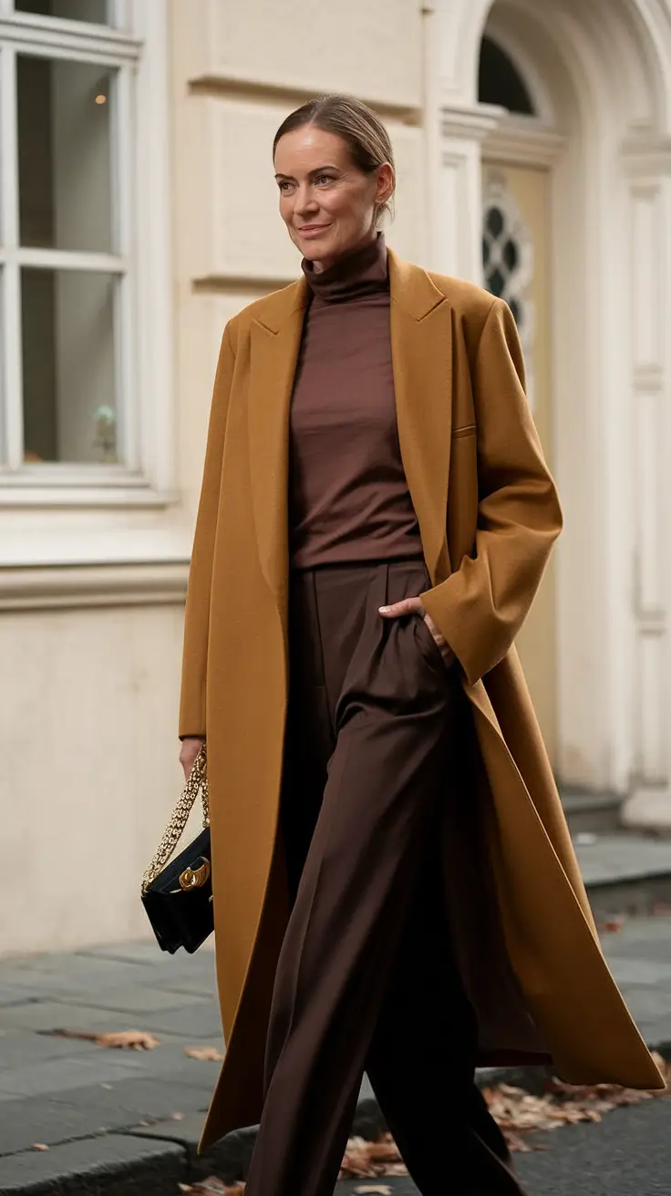 It is an excellent demonstration of fall outfits of women over 40 2025 that are both stylish and not compromising in practicality. The silhouette is precise and well-built, yet the textures and color schemes are loose and extravagant. There’s personality here, and it’s expressed with complete clarity.