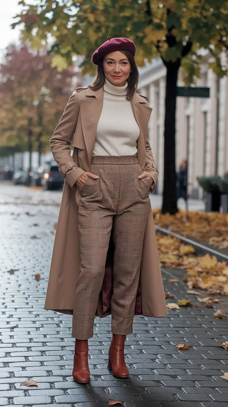 This outfit is a take on traditional fall colors yet adds the one special touch, the berry beret. There was a camel trench over a ribbed cream turtleneck and cropped plaid trousers, so it was fall sidewalk chic but with a European twist, and the warm brown ankle boots completed the look.