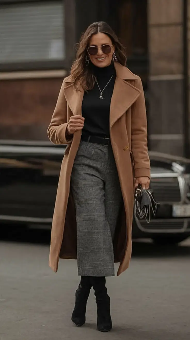 This look channels old-world texture with new-world cool. A fitted camel coat is worn over a black turtleneck and high-waisted gray wool trousers, which are tightened by a thin belt and combined with sock boots. This ensemble with a serious edge is a fall staple that is completed with a soft-structured handbag and sunglasses.