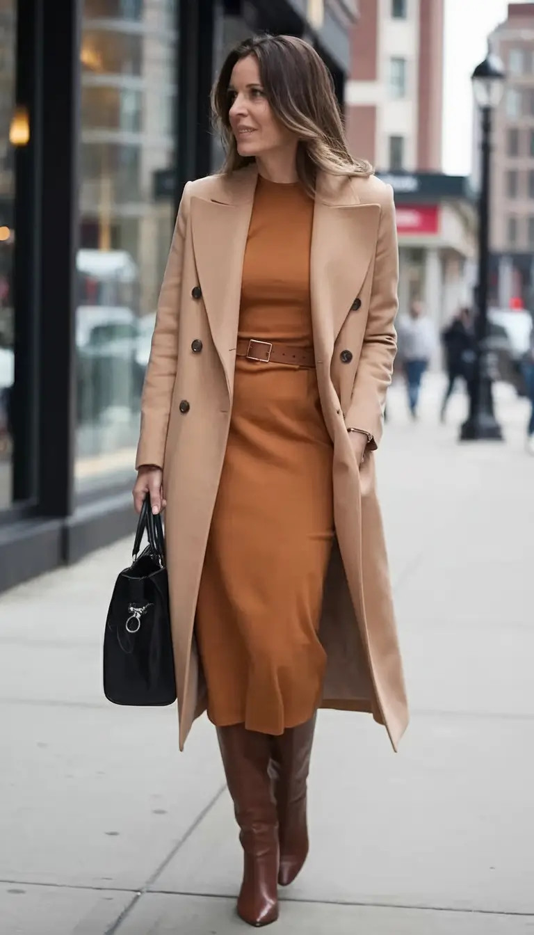 This ensemble looks perfectly within the fall outfits for women over 40 classy due to the flattering shape and the fall-enriched tones. The camel is contrasting the heat of the dress, and the boots are not an overdone drama. It’s city-polished but still wearable for daytime.