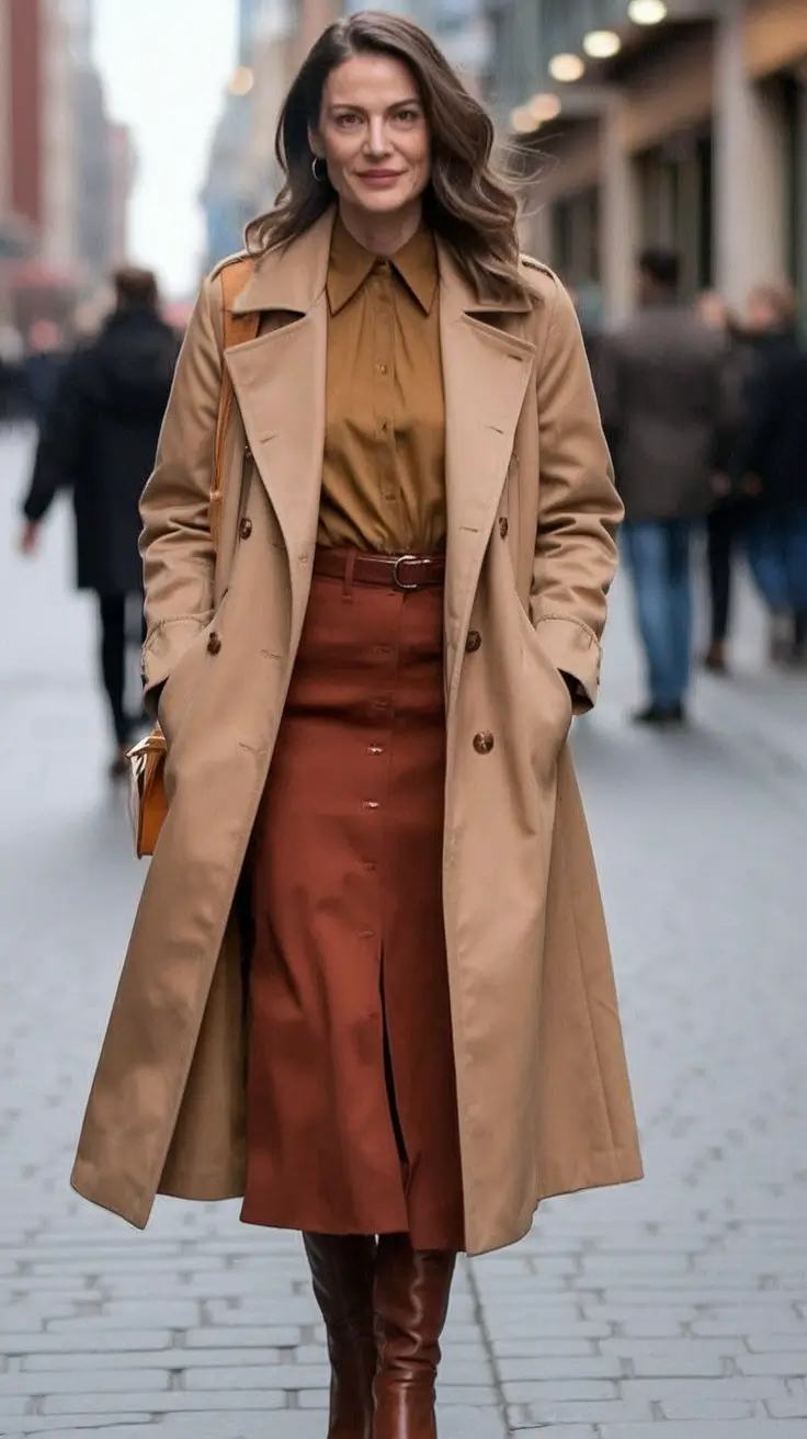 This one is distinguished by a rich mix of spice-toned colors. The midi skirt in chestnut-brown and cinnamon-colored shirt that is neatly tucked in are to be completed by a structured camel trench, which is an eternal fall item we simply cannot stop coming back to. And yes, deep brown boots are long enough to lengthen the leg, as well as ground the whole.