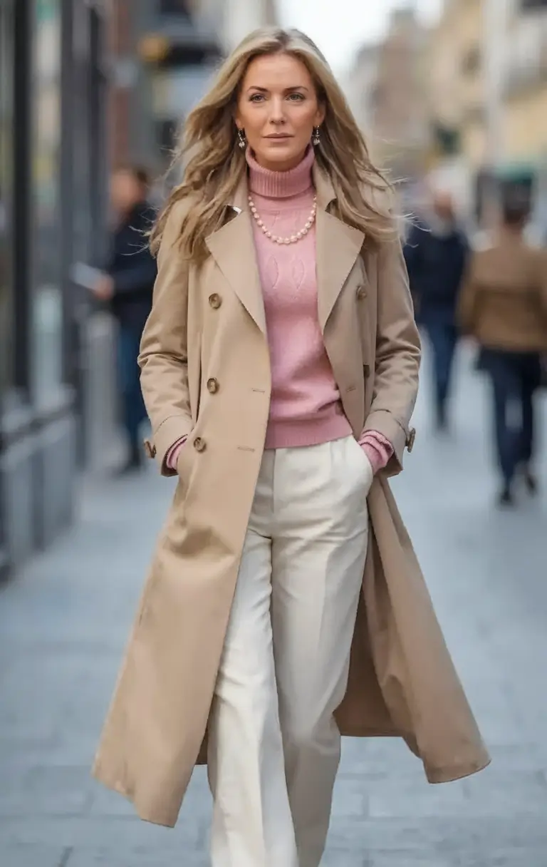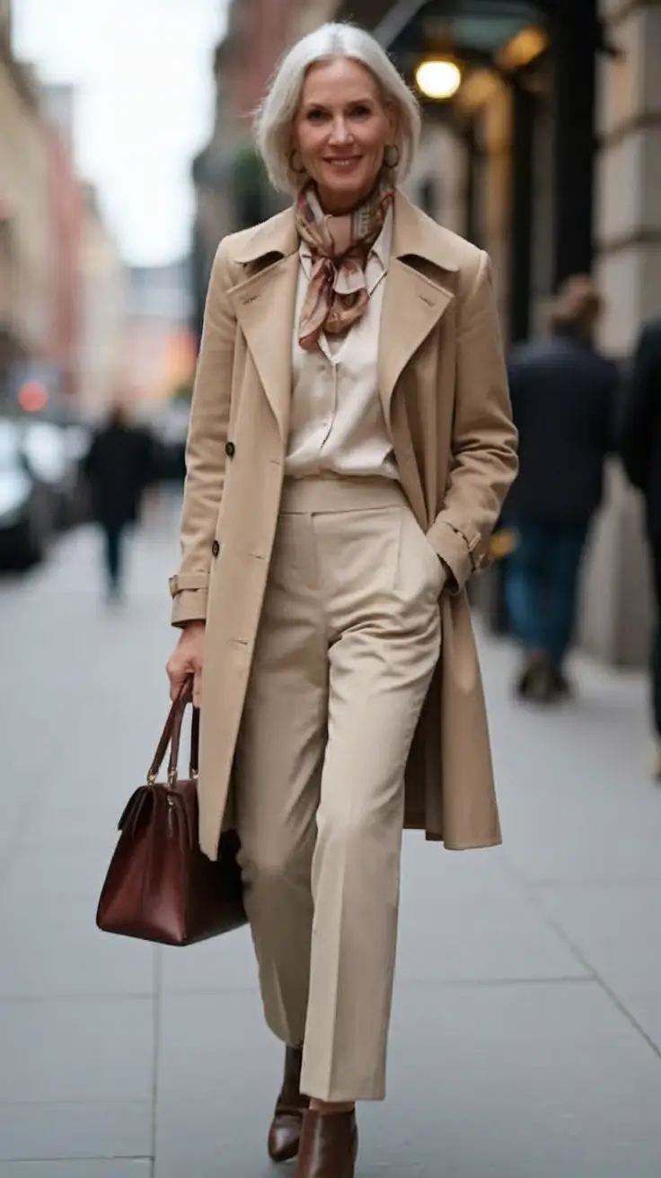 This is the definition of fall outfits of women over 40 classy structured, purposeful, and versatile. The trench coat plays a particularly important role here: it is not too thick, yet it makes a sufficient statement to determine the entire effect. It is also stylishly paired with tonal trousers and a tucked-in blouse forming a smooth line without being too hard to please.