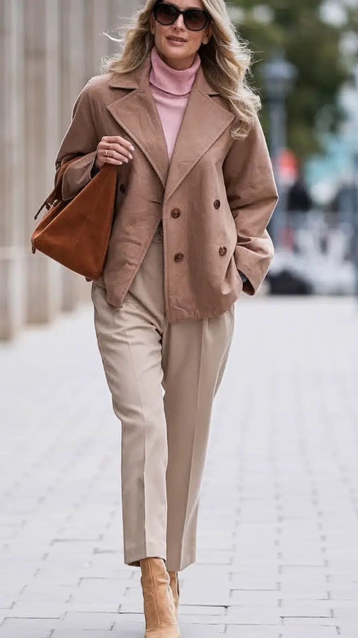 This outfit is a masterclass in monochrome sophistication. The oversized but structurally soft dusty rose wool jacket is made of wool. It has that polished-but-effortless vibe, when it is layered over a muted pink turtleneck and sand-colored trousers. The tote is large and made of brown suede so it can be casual enough to run errands but can also bring you to brunch.