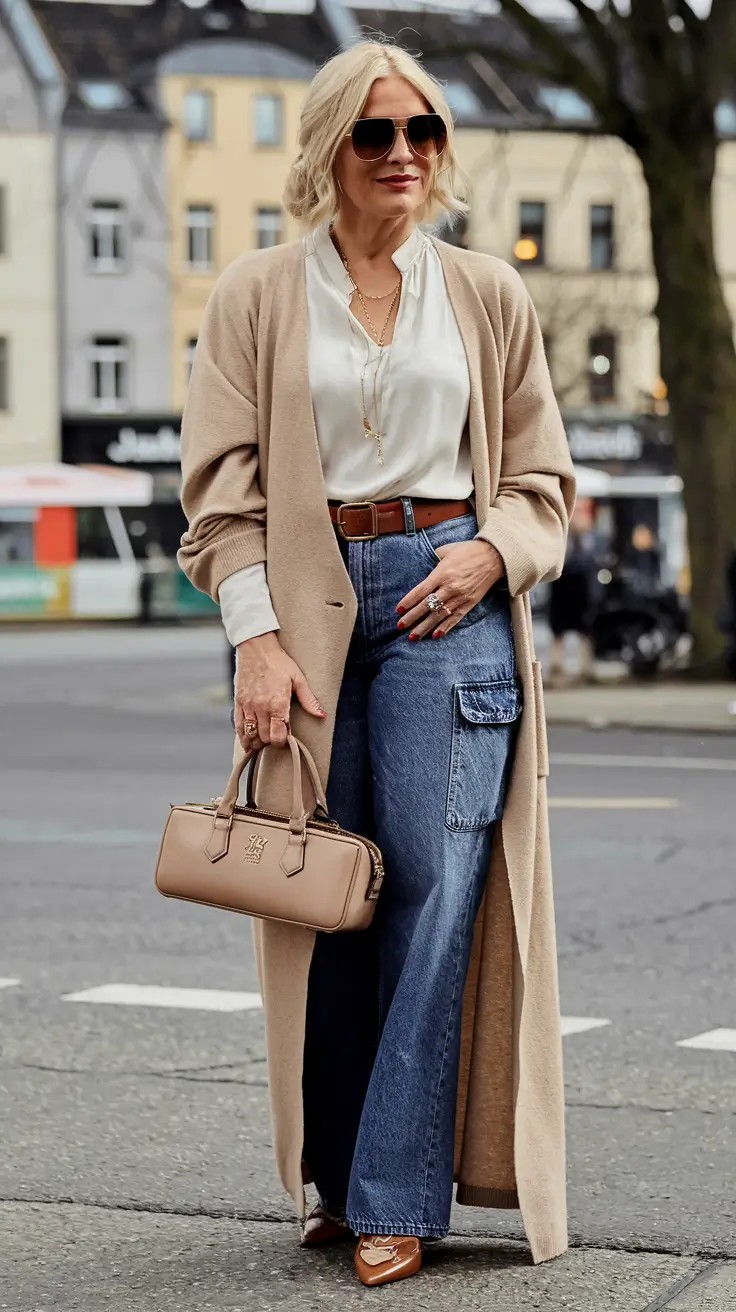 This outfit is about balance soft top, structured pant, and long outer layer. It feels comfortable and refined all at once. This fits well in the category of fall outfits for women over 40 casual that does not lack city confidence.