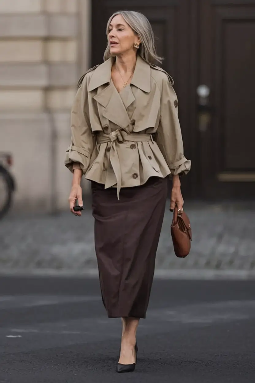 This is just style conflict at its finest point. Then you have the oversized belted trench jacket on top, which tightens the waist and adds some proportion to it. Next, bam, the surprise combination with a sleek and chocolate brown midi skirt. Add in a small top-handle bag and pointed pumps? You’ve just redefined modern femininity.