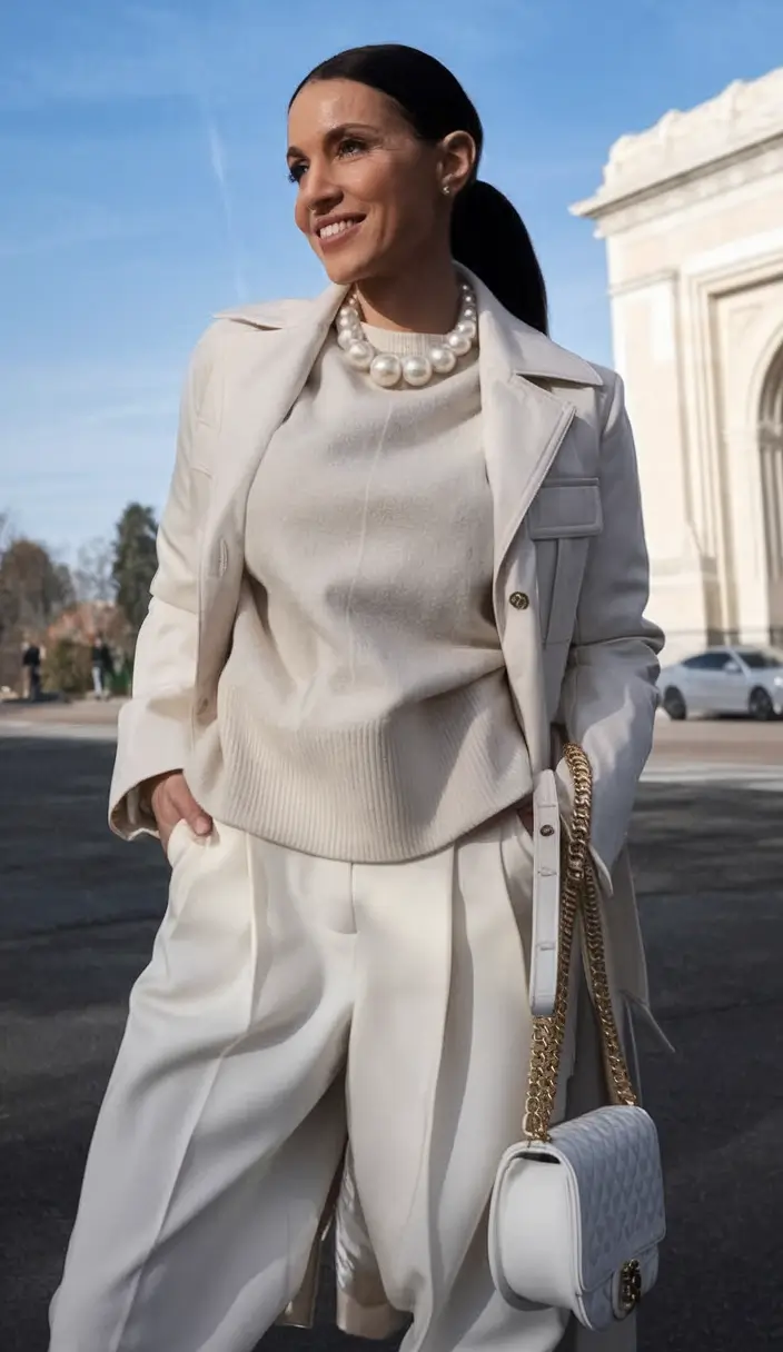 Something is just so strong about head-to-toe ivory during the colder months- like a little whisper in a room of noise. This look takes layered neutrals to another level. A customized trench coat is matched with a knit sweater and pleated pants. The oversized pearl necklace and quilted chain-strap bag speak of sophistication but does not shout out.