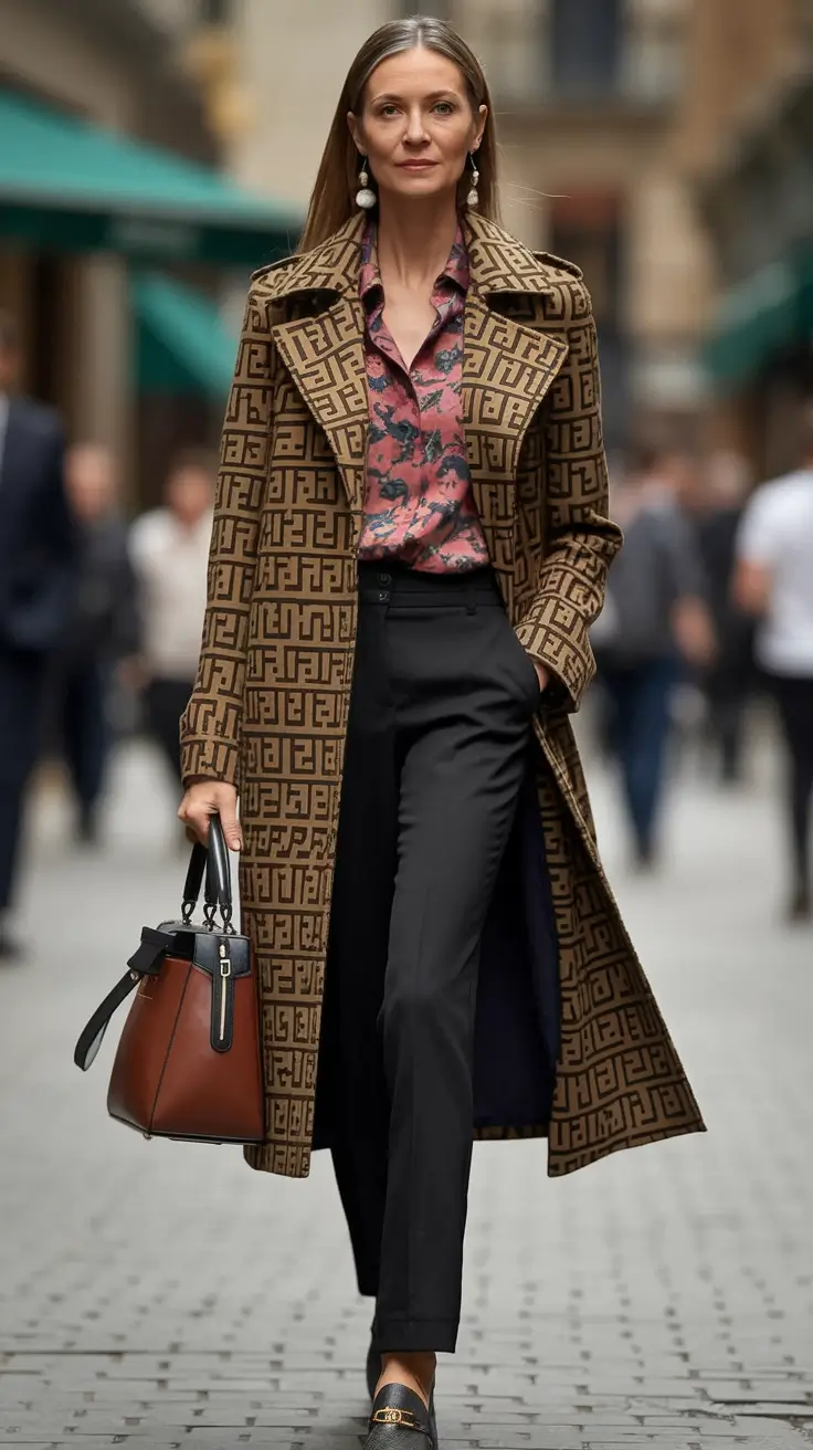 The combination here is impressive a monogrammed longline coat on top of a colorful floral blouse and supported with tailored black trousers. It’s a head-turning combination of heritage pattern and romantic detail, perfect for women who aren’t afraid to blend the old with the new. The burgundy loafers and the structured handbag tie it all in one fancy, luxurious instance.