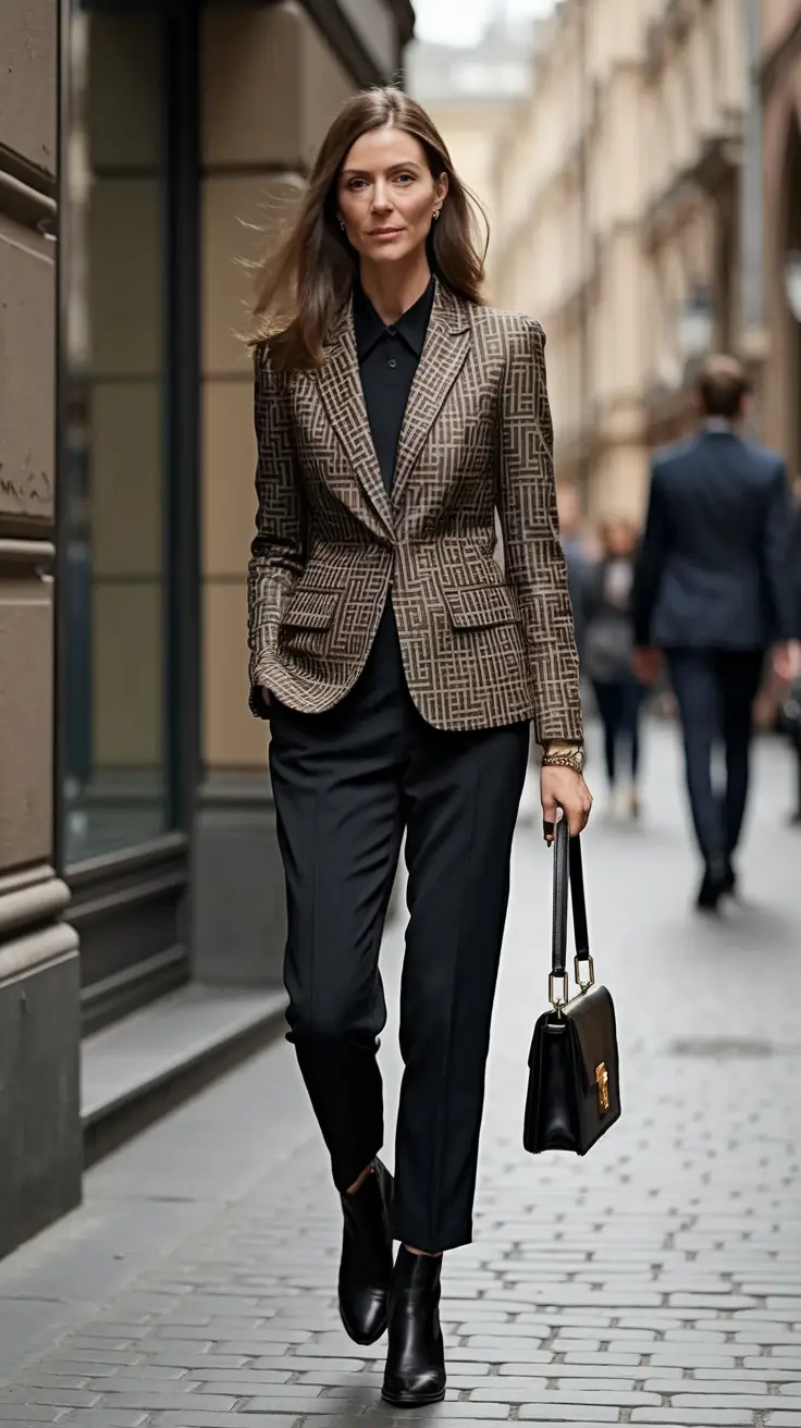 This ensemble is an object-lesson in understated power dressing. The structured blazer featuring a luxurious monogram pattern does all the heavy lifting, whereas the black blouse and ankle-length trousers make it down-to-earth. It is no mere frippery, but fine material, fine workmanship, and something finer still, an attitude. It’s clean, sharp, and deeply modern.