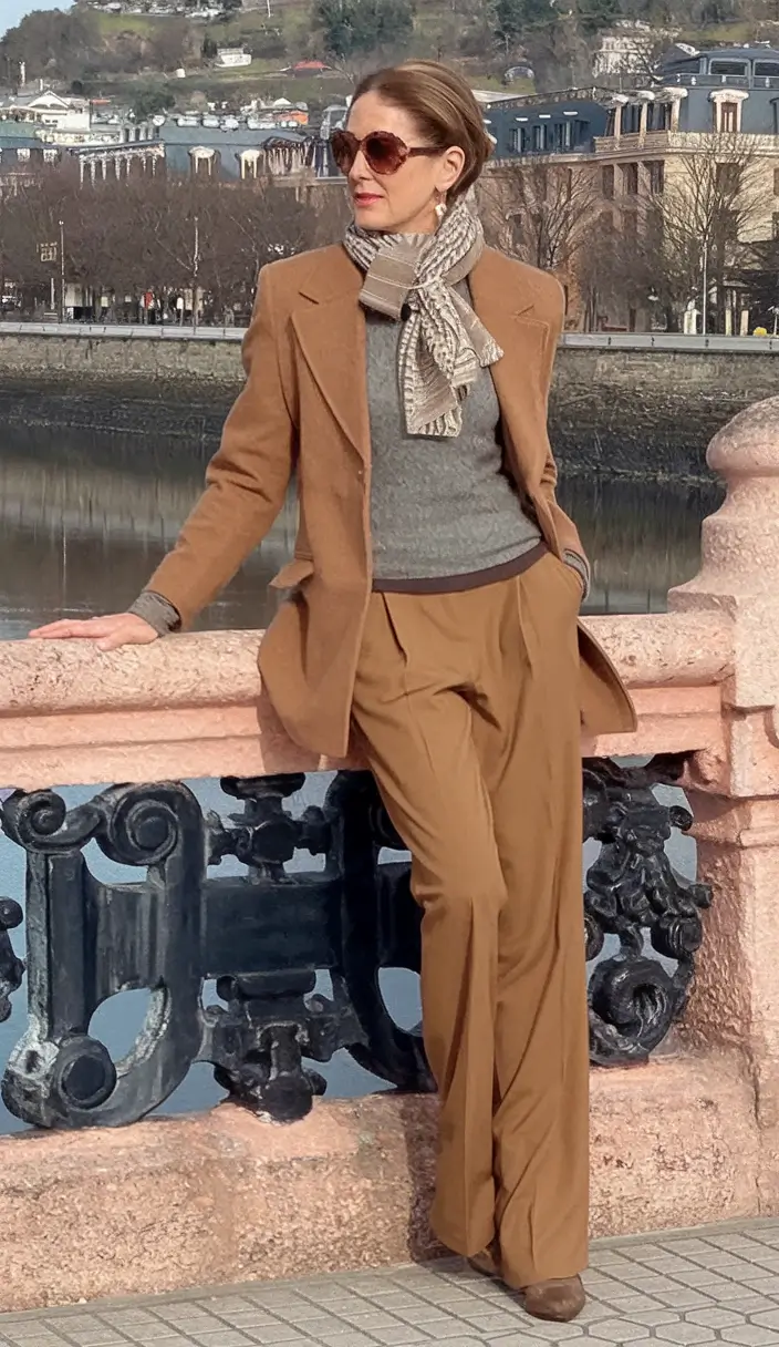 It is one of those casual women over 40 fall outfits that does not lack sophistication. All is fluid and balanced: the loose fitting of the pants, the masculine-feminine interplay of the coat, and that touch of texture in the scarf. It is practical fashion at its best and it is real life ready.
