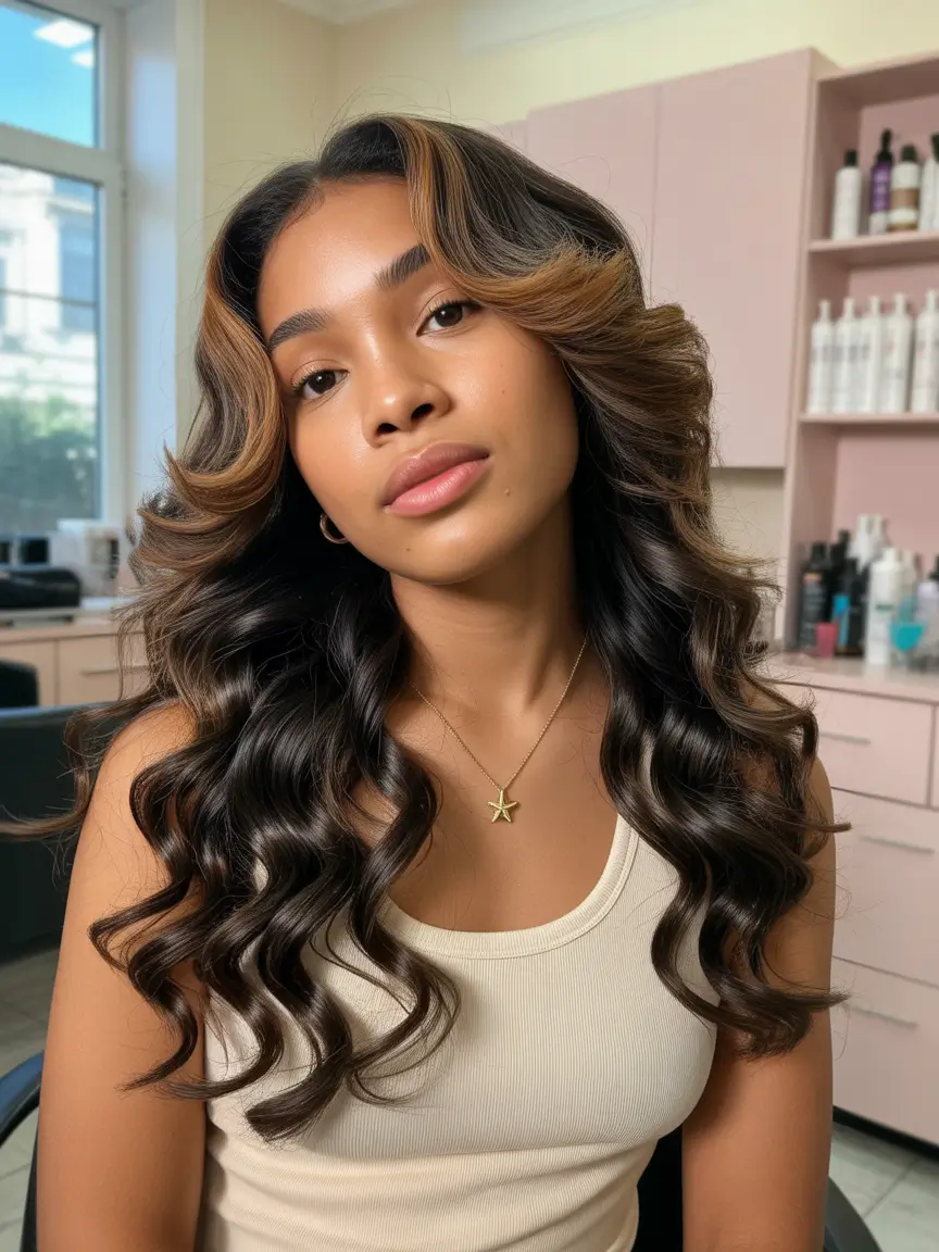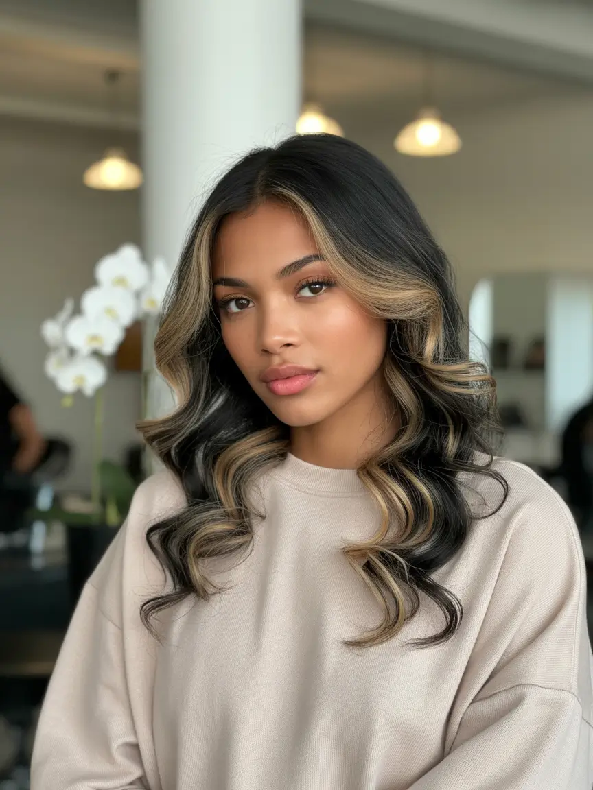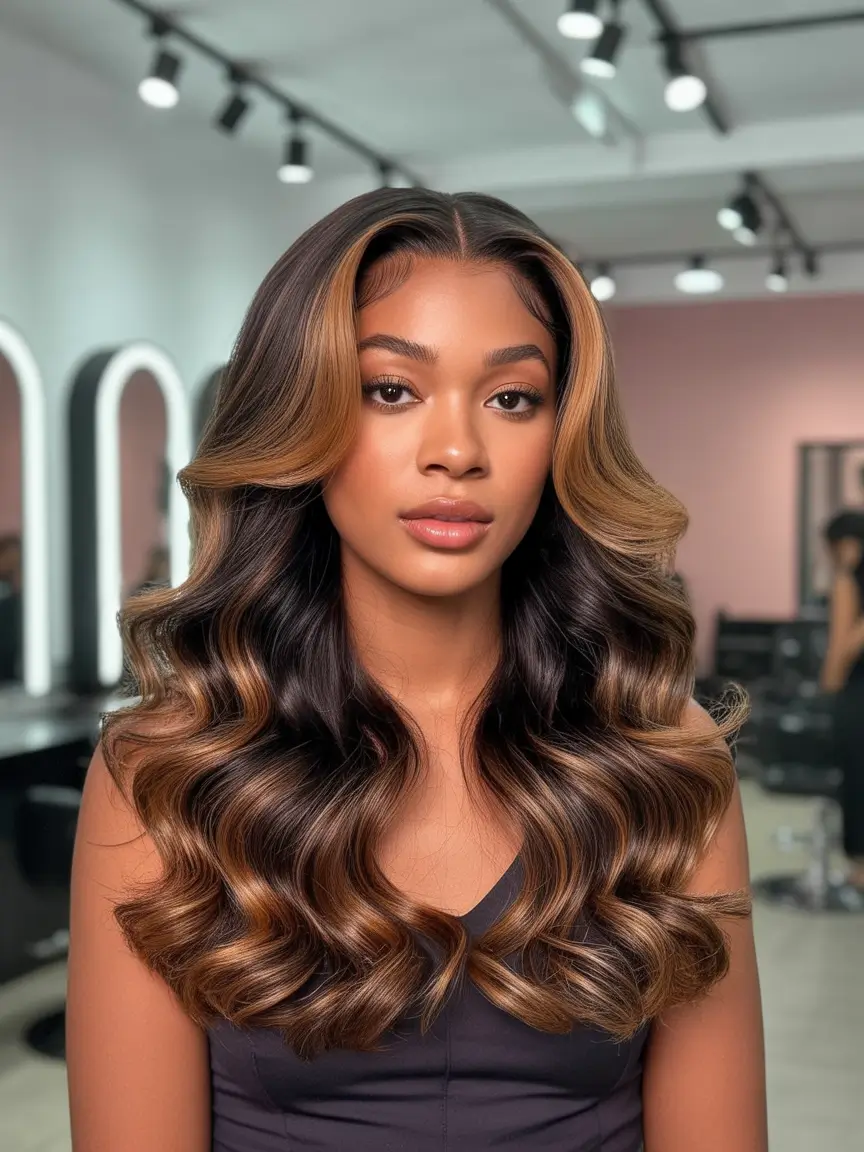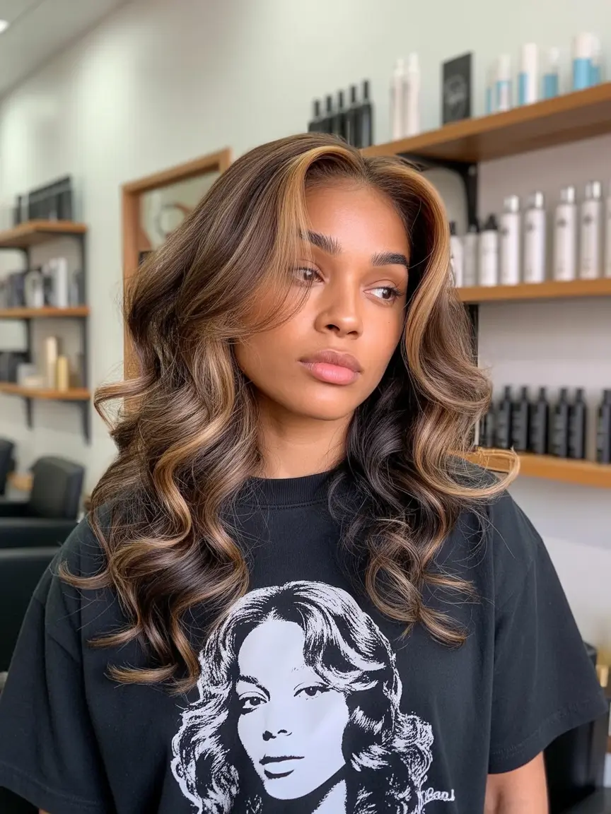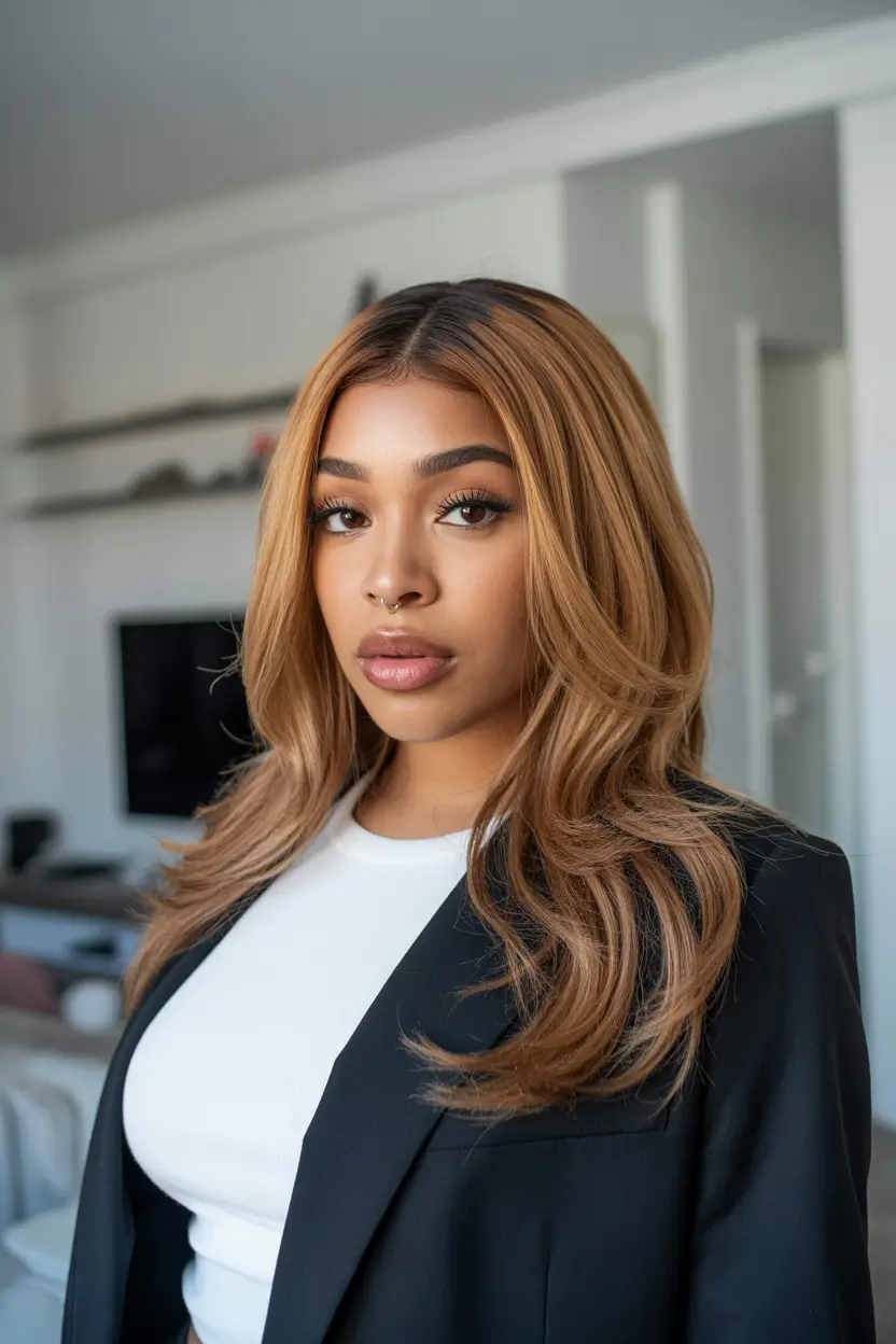 Buttercream balayage is mushy, dreamy and a bit playful. It is among those adorable winter hair colors that black women are able to roll back their hair without losing class. The golden curls are soft and creamy and serve to complement the warm rich skin tone of the face. I like best that the color is flowing through the layered waves in a smooth flow, it is also dimensional, modern, and gives gentle sophistication.