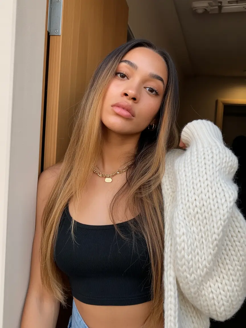 My favourite part is that it frames the face: caramel strands are light without creating contrast and mocha undertones make the look grounded. This color works well with winter clothing -cashmere, jeans or the black coat you like.