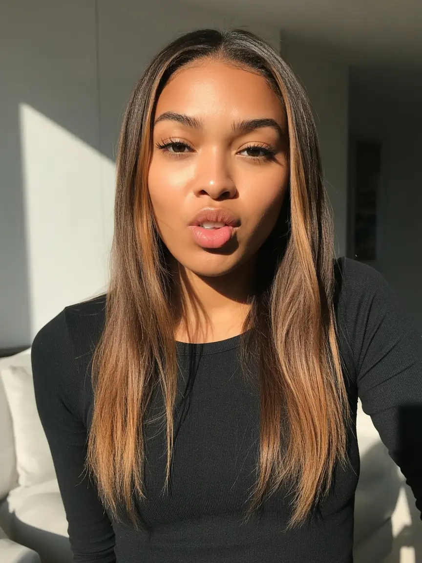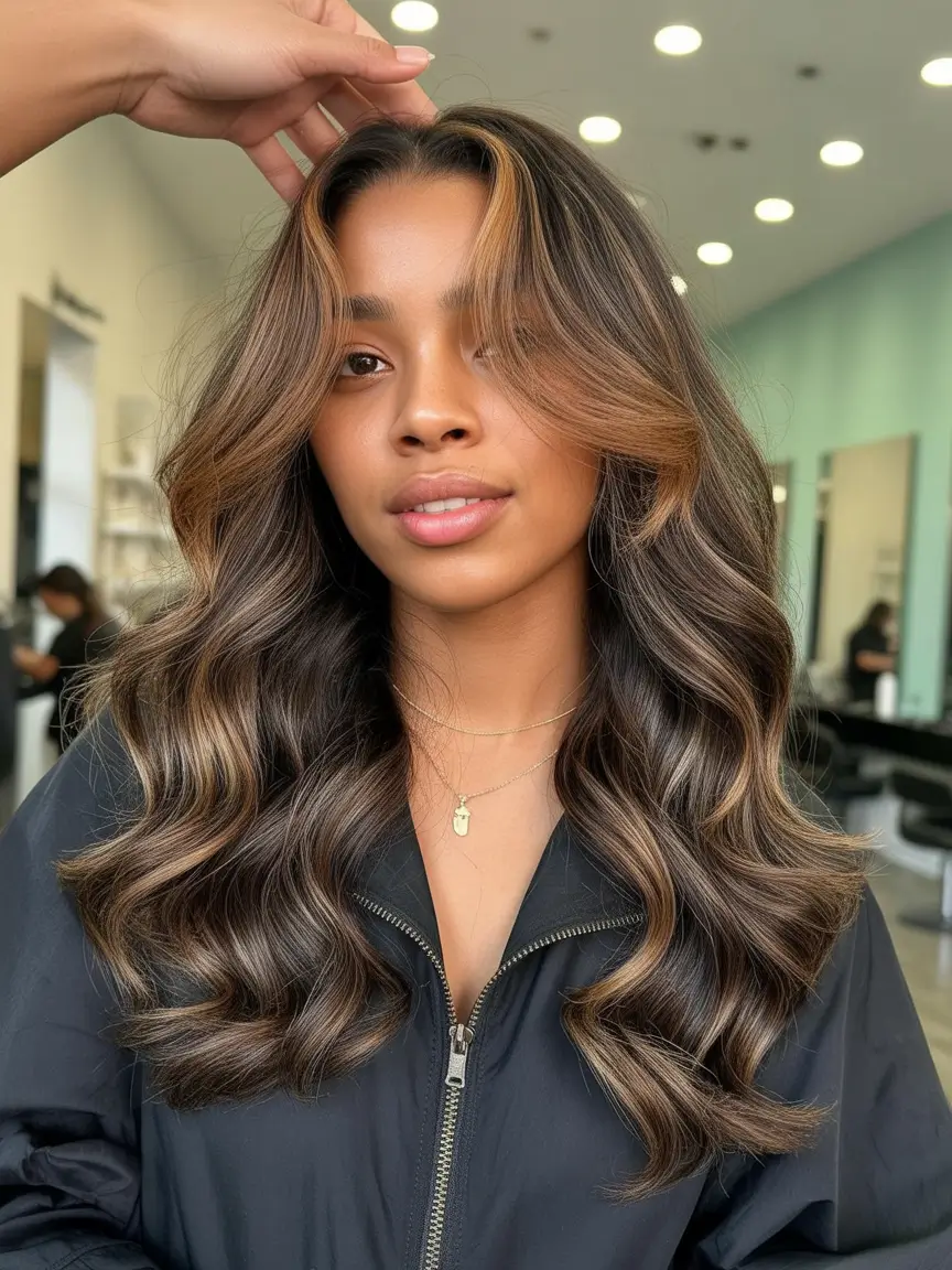Bronze balayage – the pinnacle of a lowly radiance. It has a reason why stylists are declaring it one of the most flattering black women winter hairstyles in 2025-2026. The coziness of bronze colors improves all the skin colors giving them natural vitality without contrasting striking colors. I love the fact that this color creates soft contouring to the face and a halo effect when using soft lighting.