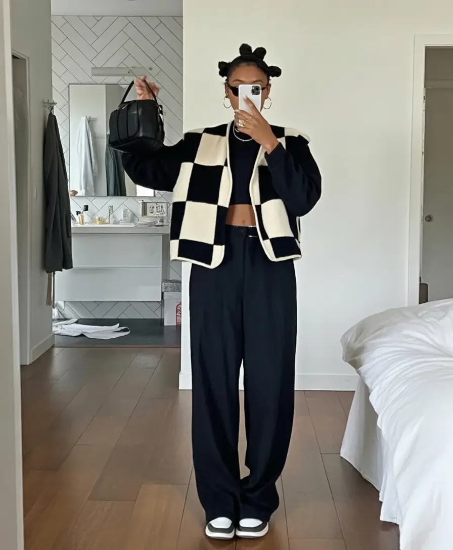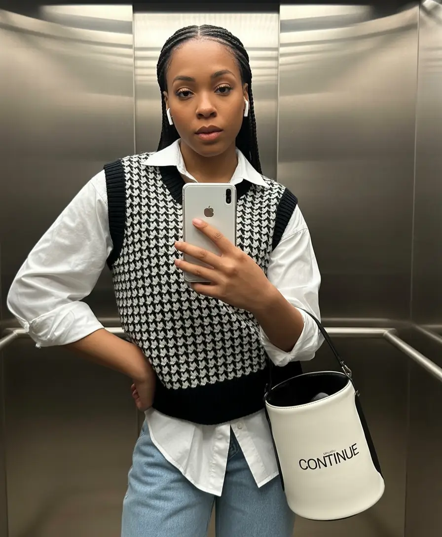 A black-and-white combo is something that seems like an easy-going intelligent option. This appearance, a fresh white shirt over a houndstooth knit vest, is the epitome of what outfits Black women should have this season. It is to the point, restrained and effective.