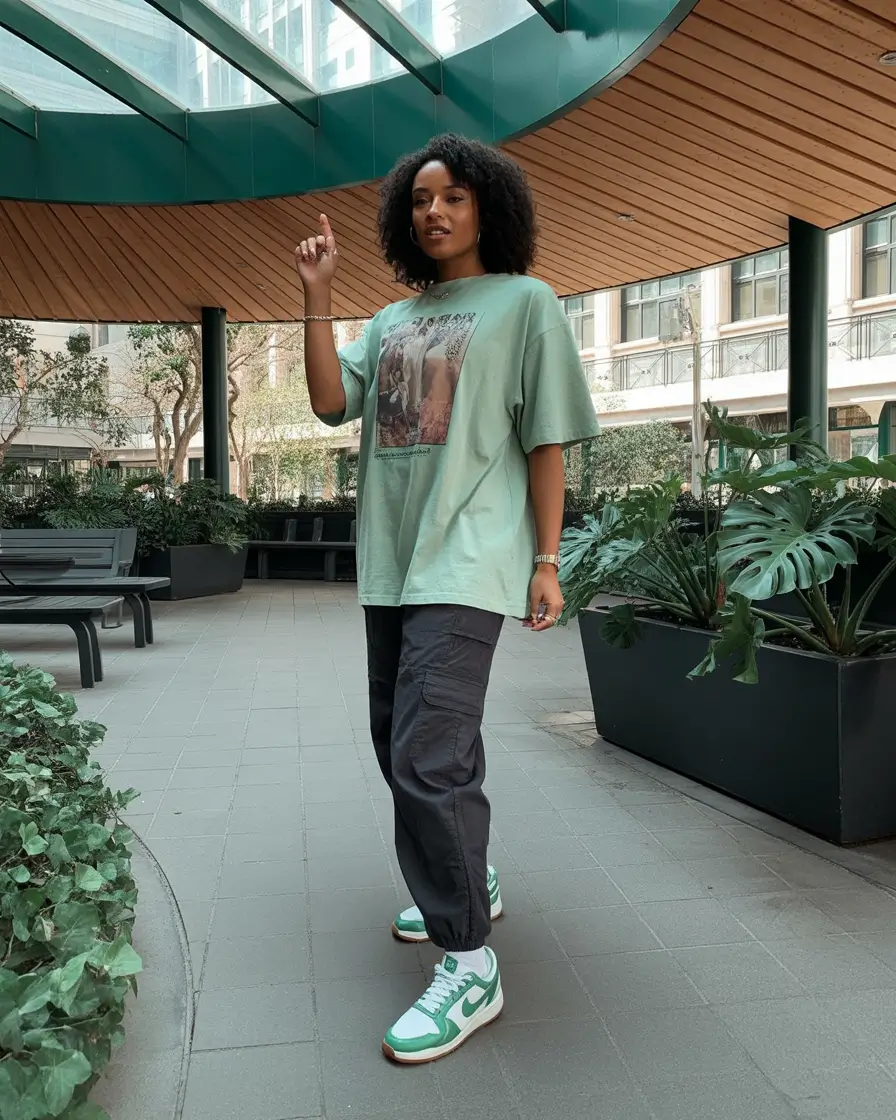 It is a breath of fresh air with this look. The oversized mint-green tee and cargo dark pants and two-tone sneakers fall right in that indifference zone between nonchalance and cool. It is informal, yet it is fashionable. I would describe it as the staple of Black women in summer lightweight, easy-going, and full of character.