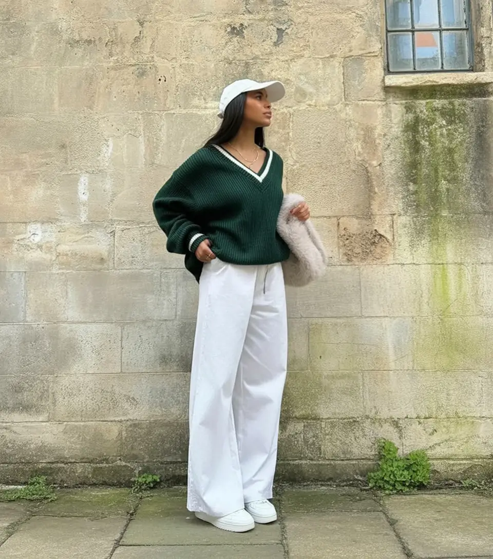 I like when a piece of clothing is comfortable and presentational. This dark green oversized v-neck sweater combined with wide-leg white trousers are a visual tranquility that simply works. It is bringing college coolness with a touch of gentleness – the appearance that is most ideal to wear on the clothing of Black women fall. The modern territory is easily accessible due to the crisp white sneakers and the baseball cap, which make it easy to wear.