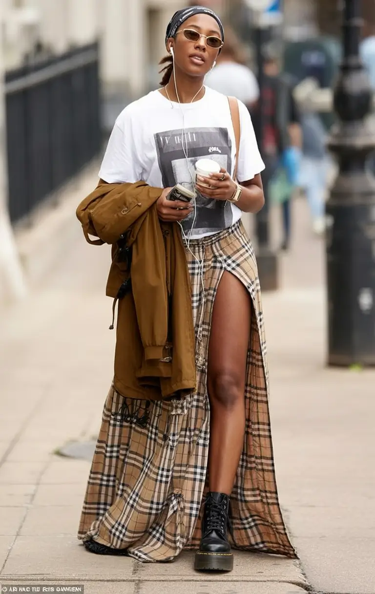 This outfit is pure charisma. The plaid skirt and that sky-high slit and a simple graphic tee — that is what I refer to as fearless balance. It is one of the Black women summer outfits that require one to take a second look but does not overdo anything. The casual tie at the jacket of brown color and the bulky boots make the entire appearance look more real worldly, urban.