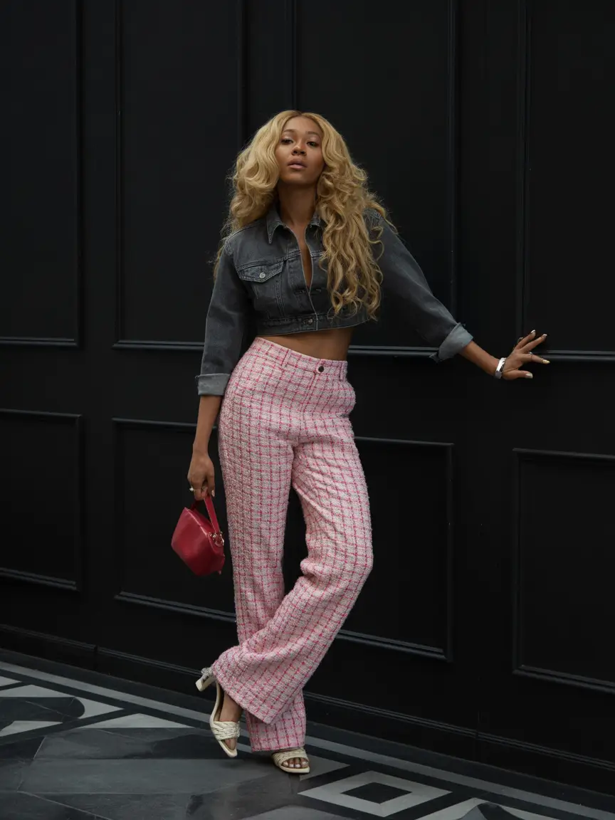 In 2026, the concept of power dressing will have a different definition, and this appearance embodies it perfectly. The high-waisted pink tweed pants and charcoal denim jacket that is cropped and styled are providing high-fashion appeal with comfort wear. I love the way the red mini bag gives the palette the splash of character without disrupting it. It is shiny, proud, and smooth, which is precisely what I put in my mind when I think about clothes that Black women wear classically.