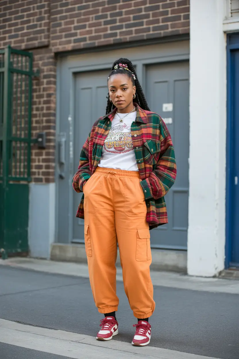 There is cozy and color that this outfit brings. A plaid flannel shirt over an old-vintage tee and bright orange joggers — it is cozy with a sense of style. The combination is nostalgic and makes me think of the old-school streetwear re-created in the present day. It is one of those Black women fall outfits that can easily be used in running errands and at meetings.