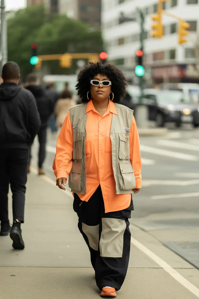 Utility wear is still dominating 2026 and this is one of the best ways I prefer wearing it. It does not even need to be shifted to say that the oversized orange button-up in combination with beige utility vest and two-tone cargo pants makes a statement. It is daring, put-togethers and performance-based – the ideal outfit that Black women streetwear this season.
