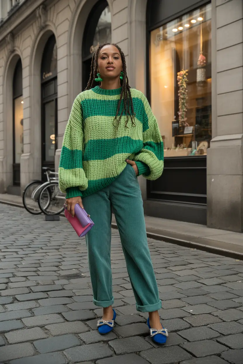 It is a similar appearance to all that I admire about transitional dressing: a high level of color, gentle fabrics, and silent self-confidence that come with being comfortable in your own skin. The oversized striped sweater with the green color cannot be worn without a quick boost in mood, which is why when being combined with the corduroy pants, the piece becomes the best mix of vintage and modern. I would wear it in Black women fall outfits it is warm, and innovative with a lot of character.