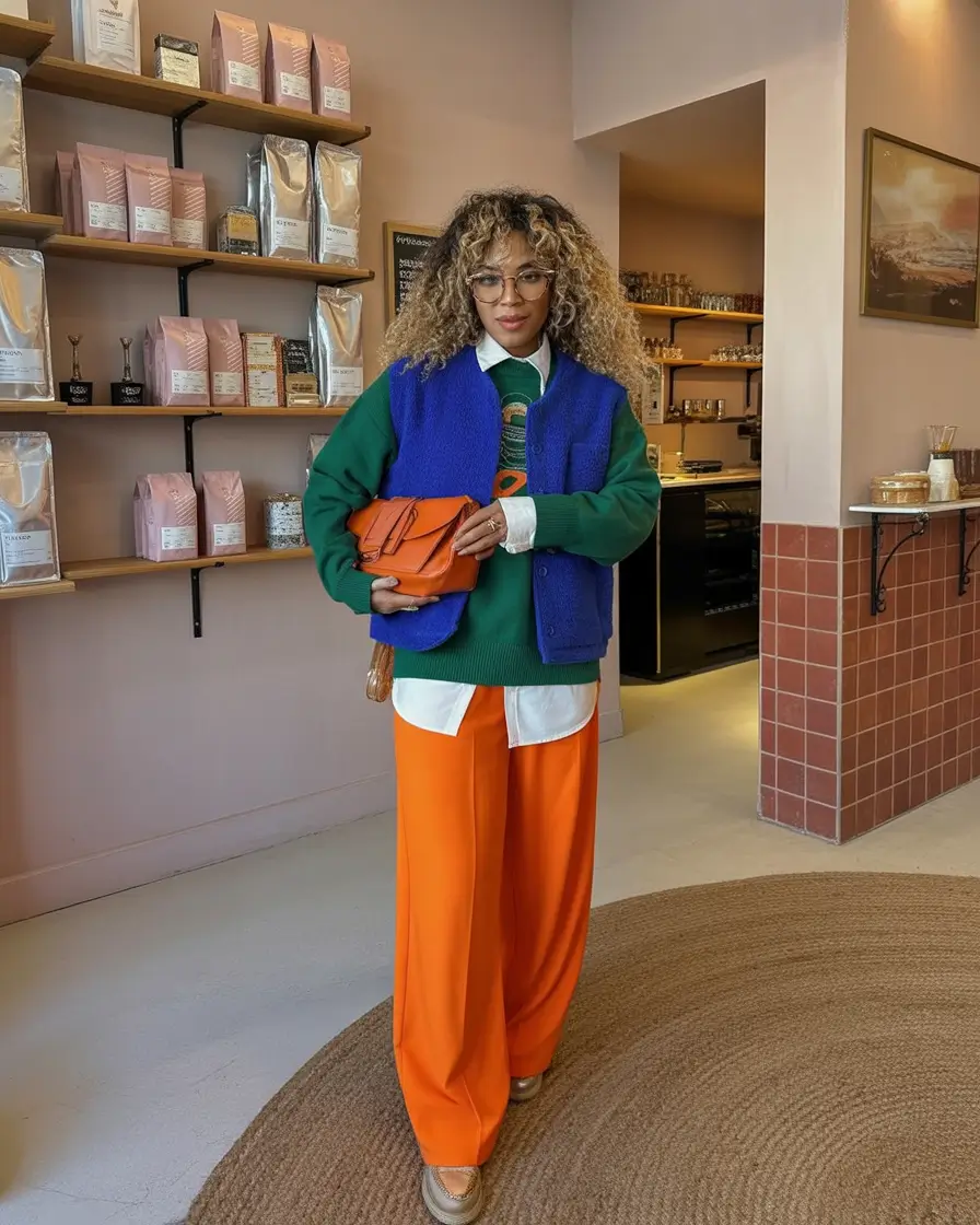 Something magnetizing in this palette, deep green, electric orange and the touch of pop of royal blue. This costume does not obey the color theory but recreates it. The green sweater over the white shirt and bright orange pants is daring and happy, just as the clothes of the Black women casual are supposed to be in 2026. It is coffee-run appearance that is also allowed to enter a creative meeting.