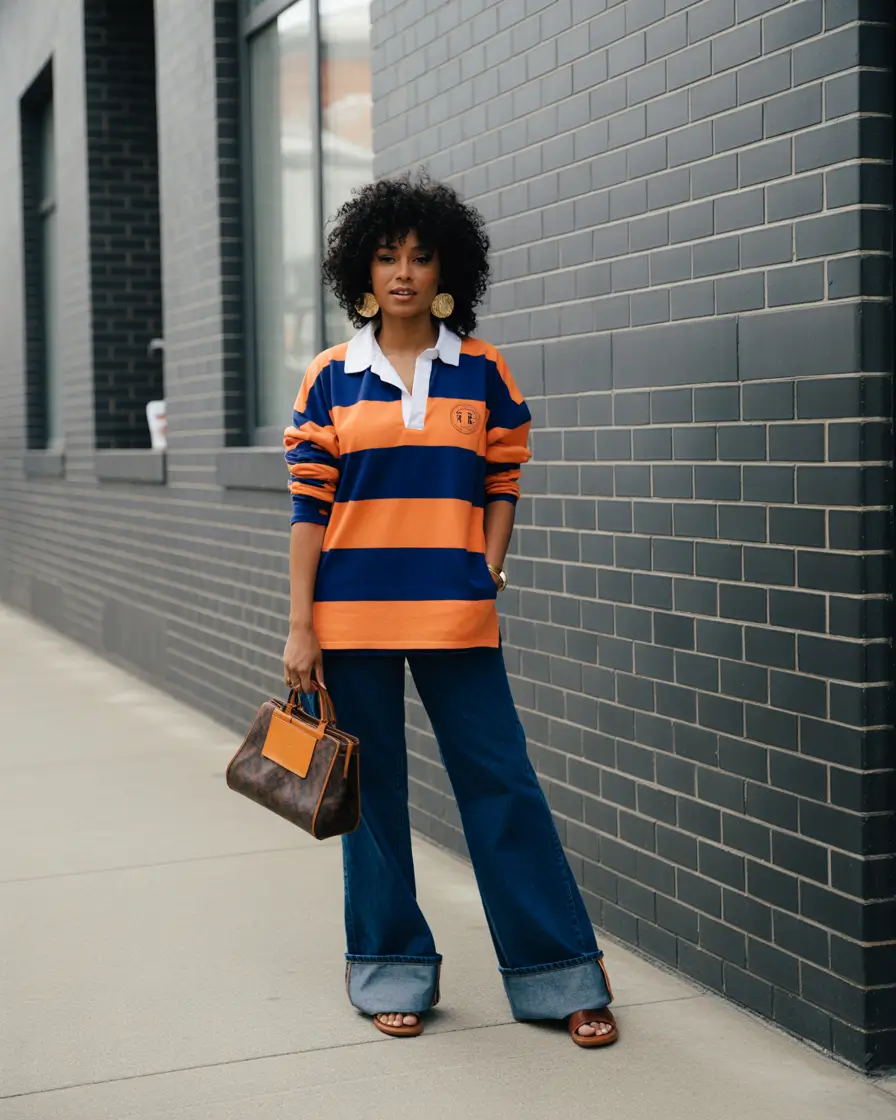 This garment is a vintage sporting outfit that will make it into the new generation. The bold navy and orange striped rugby shirt and wide cuff denim are such great materials of throwback and nostalgia. It is sporty, intelligent, and so-stylish. I adore the fact that it winks at preppy style and at the same time can be incorporated in all outfits that can be considered as street wear among the Black women – easy yet authoritative.
