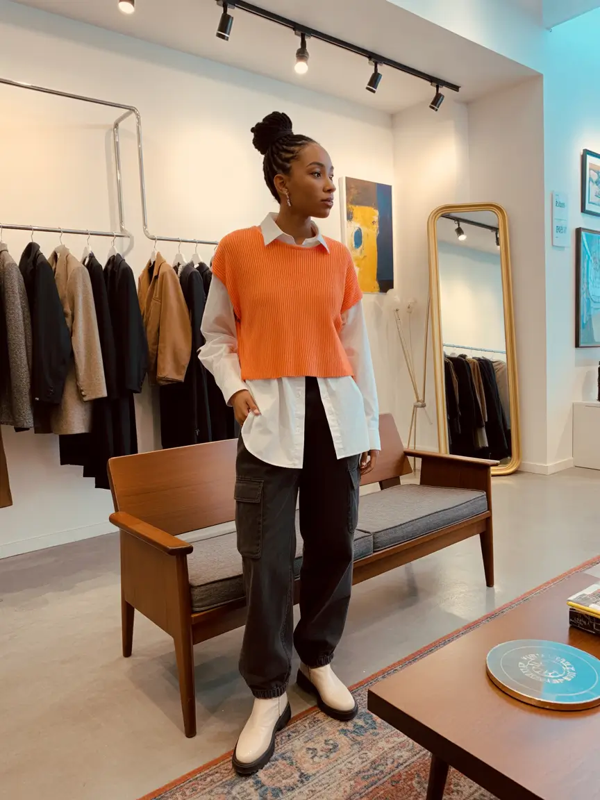 This appearance is an evidence of the fact that minimalism does not have to be neutral. Even the shortened orange knit vest on a chilly white shirt offers a sense of structure and character to daily dressing. Uber-cool in a dark pair of cargo pants and ivory boots, it is both fresh and deliberate — fit the outfits of Black women who are dressed classy with a youthful touch.