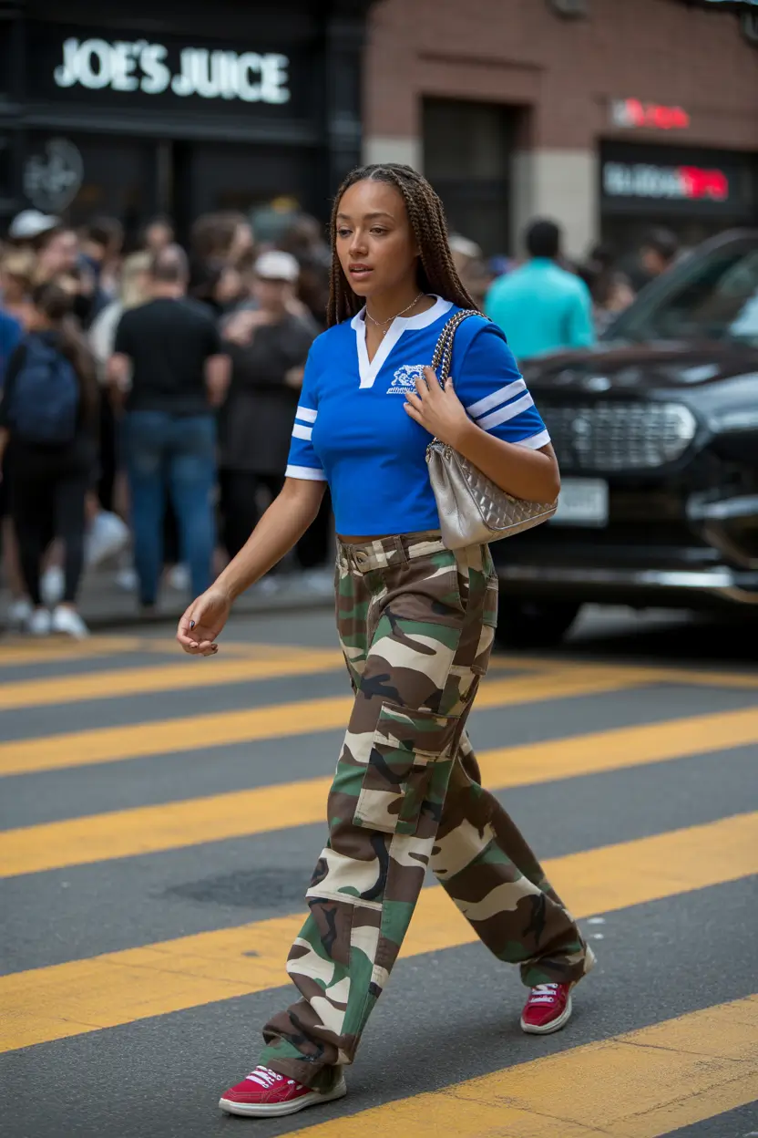 The combination of street clothing and nostalgia is something quite easy to feel power with. It is a combination of a cobalt-blue rugby top and old fashioned camouflage cargo pants – college vibe and downtown girl. The use of contrast of colors is fresh and alive. It’s playful, sporty, and so 2026. Whenever I consider what the Black women can wear as casual, this is precisely what I mean to say, comfortable, cool, and easy to move in.