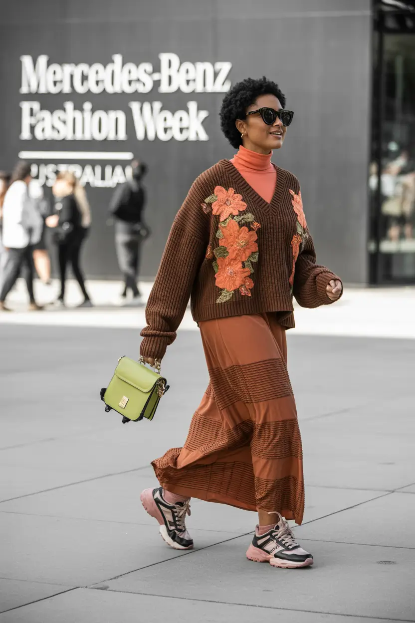 This one speaks in textures. An orange floral embroidered chocolate brown V-neck sweater over a burnt orange skirt- perfection in the fall. The worn turtleneck beneath is cozy and balancing and the result is a look that is rich, grounded, and expressive. It is the type of Black women outfits I would love to be in this year.