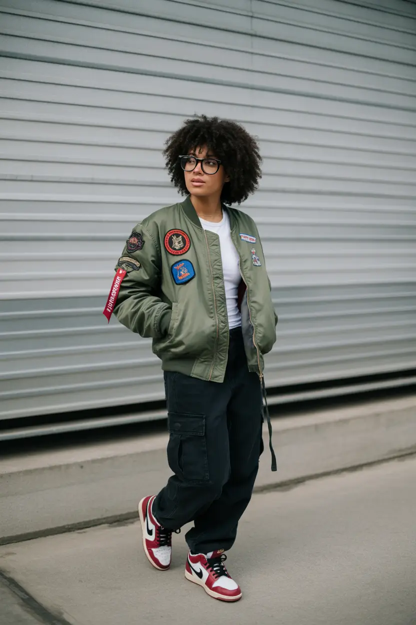 This appearance is carefree confidence, the one that does not have to make any statements. The embroidered patches on the olive-green bomber jacket add a very retro-military appeal that is immediately contemporary. Coupled with loose pants pants and a pair of sneakers, it is one of those Black women streetwear outfits that are iconic yet earthy.