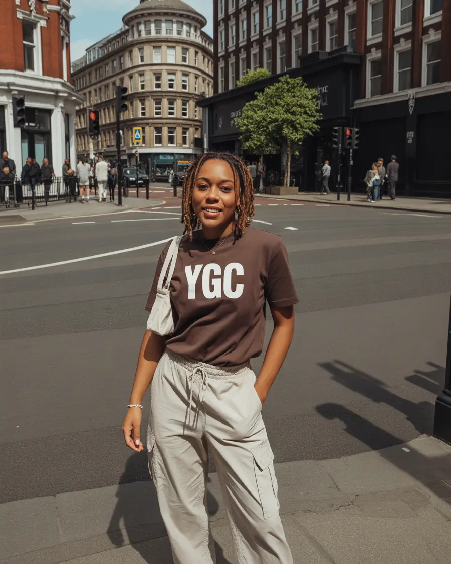 Simple does not imply basic – this appearance testifies of that. A white t-shirt with a big white writing fastened in brown in drawstring trousers sets off beige pants creating a simple monochrome look that is pure urban style. Its comfort level is high, and in the cases of clothes worn by Black women during summer it is close to perfect.