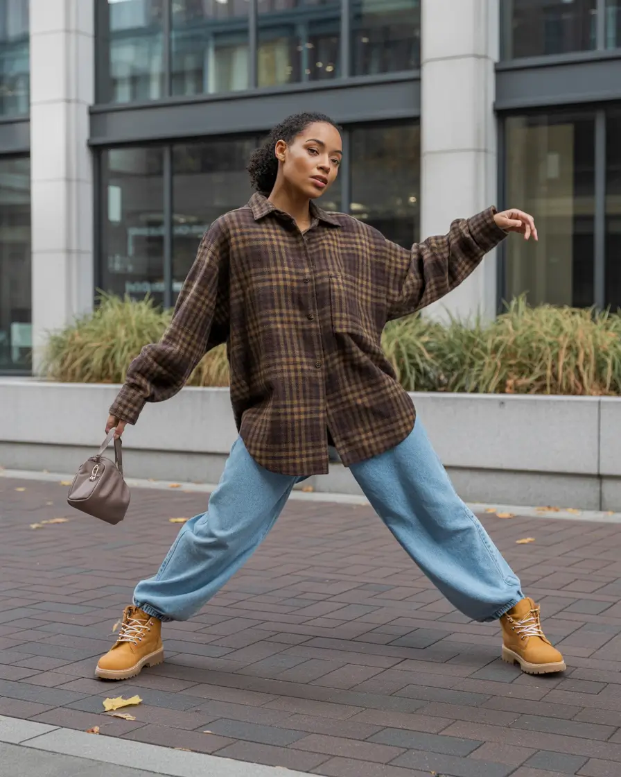 Flannel has never really disappeared in oversized, but this season, it is making a huge resurgence and I could not be happier. The rich brown plaid shirt combined with the light jeans in denim is both retro and at the same time very contemporary. It is one of those Black women fall mixes that reminds me of street wear at the beginning of the 2000s, but made better at this point.