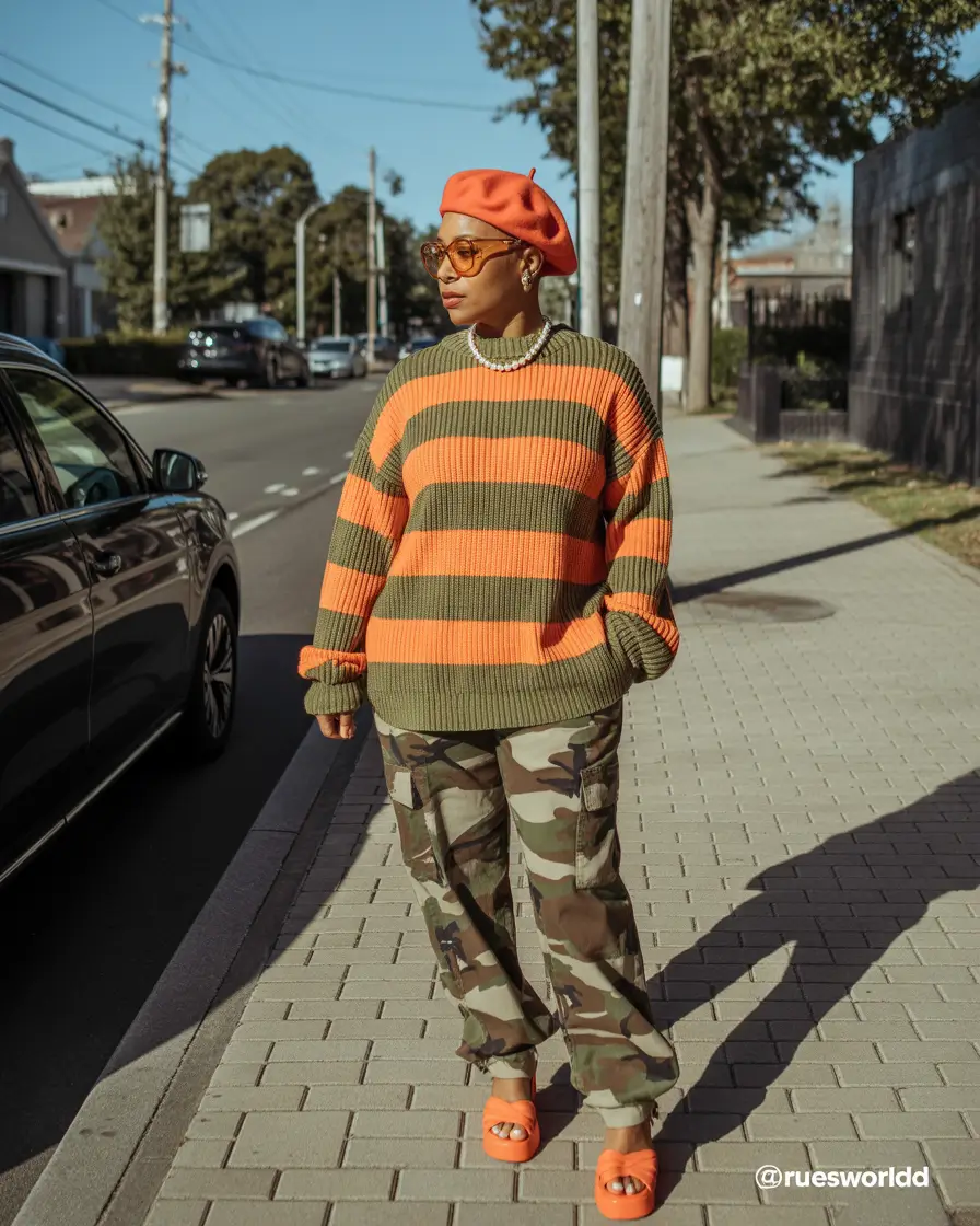 Camo pants are now officially forever. This glance is also redefining them as they are coupled with a fuzzy pastel striped sweater, it is comfortable, and cool, and a bit flirtatious. It is that city night out but cozy and the type of mood outfits in 2026 will suggest to Black women regarding streetwear.