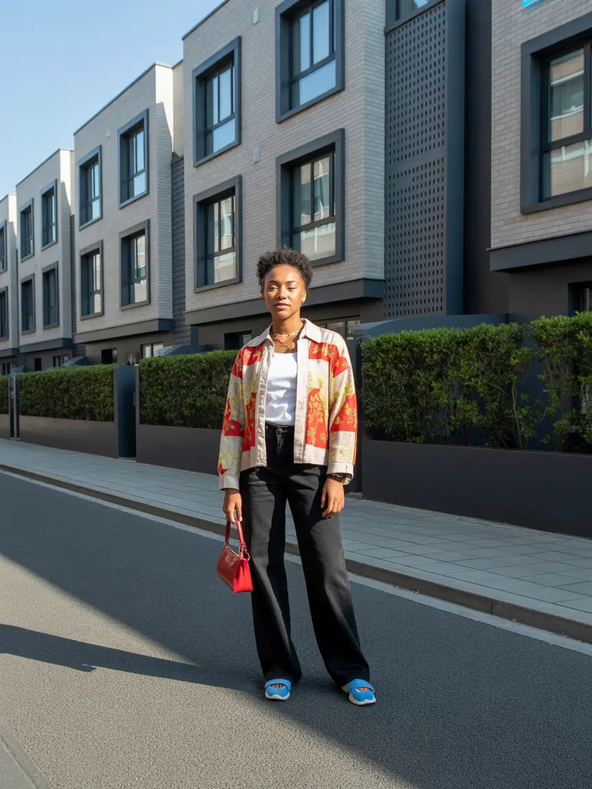 The bright slides and red micro bag are an unforeseen touch to the entire appearance that demonstrates the ability of accessories to change the mood of an outfit entirely. It serves as a reminder that street wear does not need to be neutral in order to be fashionable.