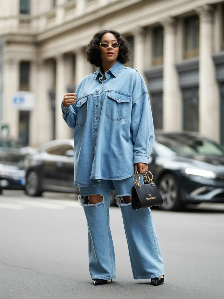 Denim-on-denim is here again, however now it is baggy, melodramatic, and purposeful. What is so beautiful about this appearance is it does not want to be fitted. It is that classy but not tailored outfit of the Black women. The large shirt fits perfectly well and it is paired with casual ripped jeans that exude easy power. It is unapologetic to come into a room with such a dress, and they felt comfortable, noticeable, and quietly bold.