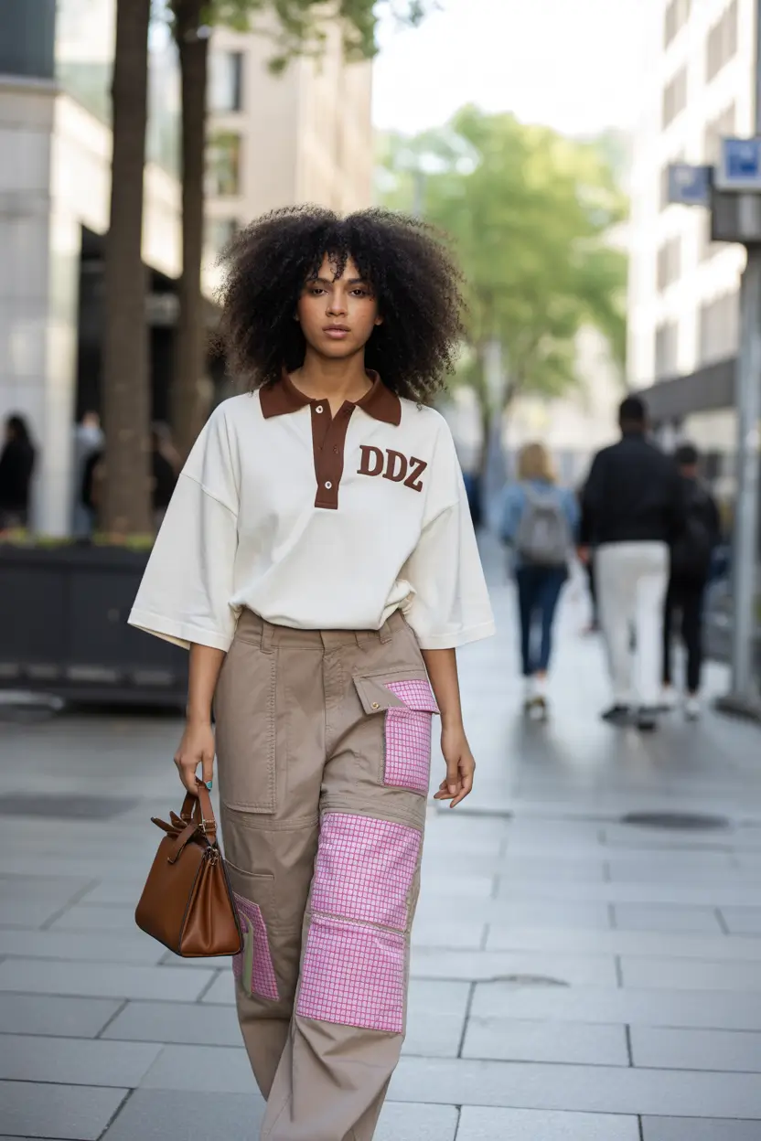 This look is pure character. Harem pants in pink accents? Say less. It is that ideal combination of street and creative -to the girls who are fashion-crazed, yet in the real world. The large cream-and-brown polo shirt folded somewhat loosely into the high-waisted jeans strikes all the right 2026 notes. There is nonchalance, yet purpose. That is what I love about the clothes of Black women in casual mode they move in between worlds, with ease.