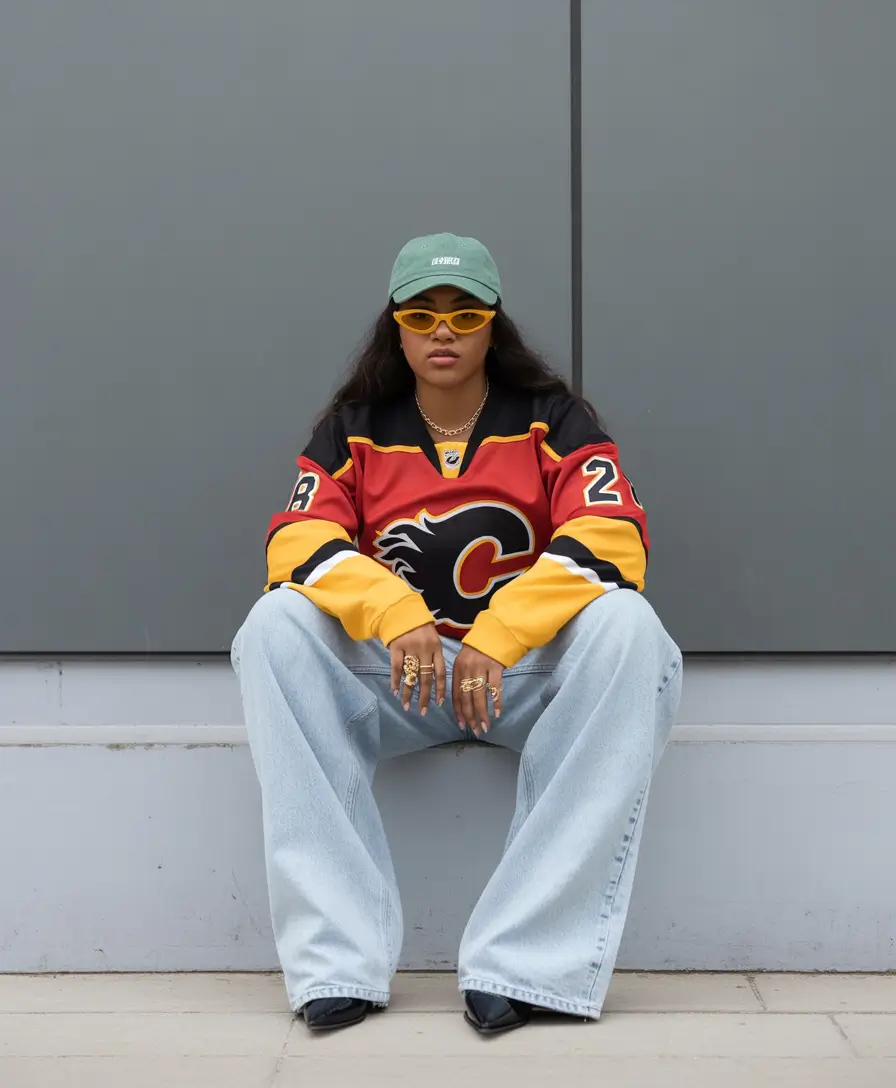 The electric-blue jersey is something that catches the eye immediately. The over-sized cut, the clean white lettering, it has a strong, dynamic statement. This outfit is fearless, as the jeans are cuffed with charcoal, and the fixation sneakers are also worn. It is the type of vigor I refer to when referring to clothes that I wear on a winter day as a Black woman; warm and not noisy, assertive and easy to wear.