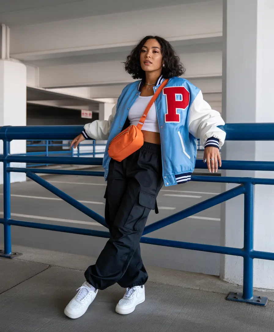 This appearance makes me remember why I chose streetwear to fall in love with in the first place, it is full of youth, self-confidence, and is not too serious about itself. The bold red P printed on the powder-blue varsity jacket is an essential in the modern times. Combined with a loose fit black cargo, white sneakers, and that bright orange crossbody bag, it is the right amount of comfort and color. I would describe it as the best outfit ever to wear in case you are Black on a casual basis, it says, I am here to live not pose.